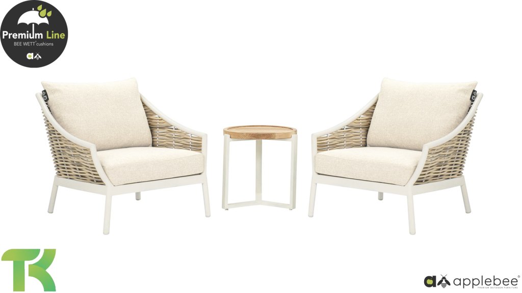 Apple Bee is characterized by the use of special Biculair® wickerwork, originally developed for professional applications in the hospitality industry. This Biculair® wickerwork is a lifelike, sustainable alternative to rattan. This highly durable synthetic rattan fiber (HDPE) is completely weatherproof, colorfast, recyclable, and therefore an environmentally friendly choice. The appearance and performance of the furniture remain unaffected by European weather conditions, and the colors retain their natural vibrancy. The superior quality of this wickerwork, verified by the Netherlands Organisation for Applied Scientific Research (TNO), is clearly demonstrated compared to other comparable materials.
