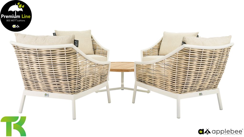 Apple Bee is characterized by the use of special Biculair® wickerwork, originally developed for professional applications in the hospitality industry. This Biculair® wickerwork is a lifelike, sustainable alternative to rattan. This highly durable synthetic rattan fiber (HDPE) is completely weatherproof, colorfast, recyclable, and therefore an environmentally friendly choice. The appearance and performance of the furniture remain unaffected by European weather conditions, and the colors retain their natural vibrancy. The superior quality of this wickerwork, verified by the Netherlands Organisation for Applied Scientific Research (TNO), is clearly demonstrated compared to other comparable materials.