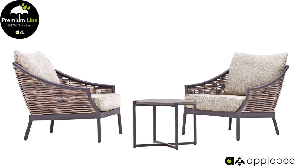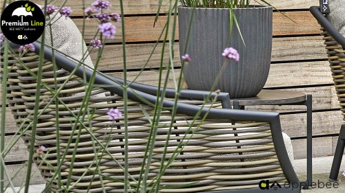 Apple Bee is characterized by the use of special Biculair® wickerwork, originally developed for professional applications in the hospitality industry. This Biculair® wickerwork is a lifelike, sustainable alternative to rattan. This highly durable synthetic rattan fiber (HDPE) is completely weatherproof, colorfast, recyclable, and therefore an environmentally friendly choice. The appearance and performance of the furniture remain unaffected by European weather conditions, and the colors retain their natural vibrancy. The superior quality of this wickerwork, verified by the Netherlands Organisation for Applied Scientific Research (TNO), is clearly demonstrated compared to other comparable materials.