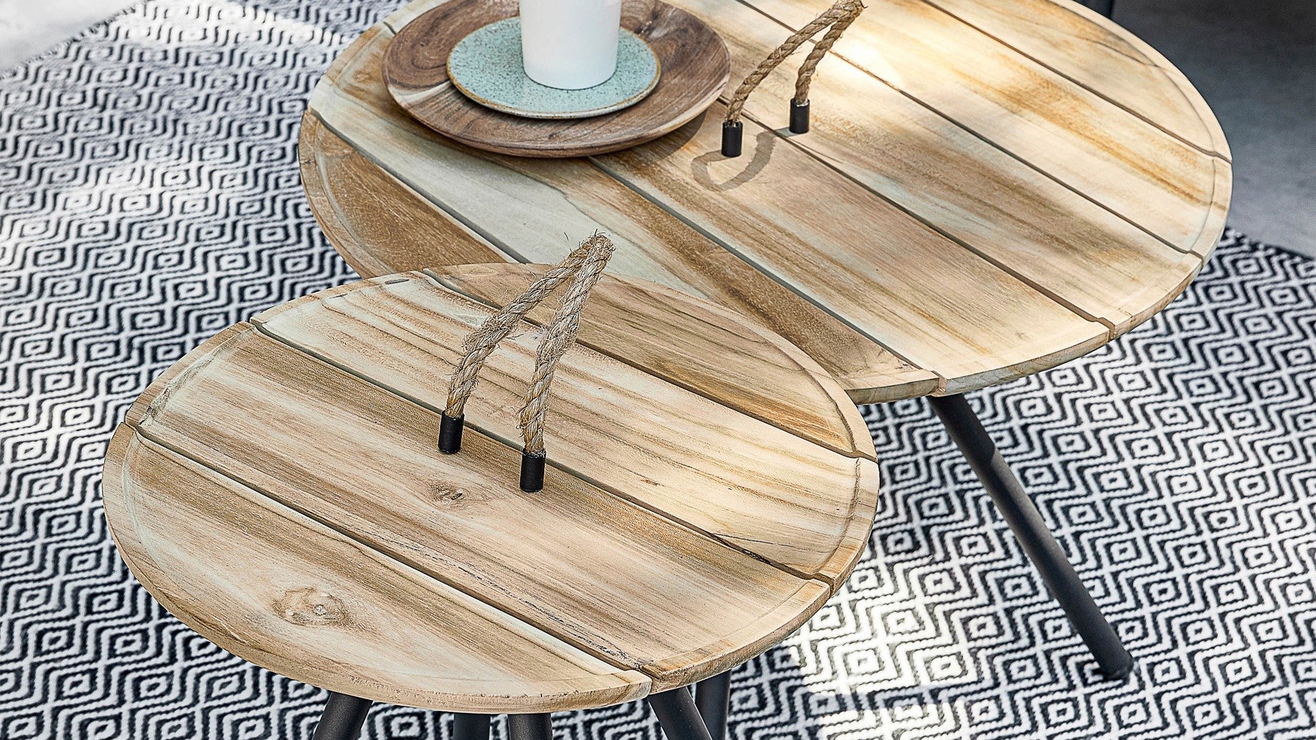 These Elle Apple Bee coffee tables are incredibly easy to combine because they're made of both wood and aluminum. The beautiful natural color combined with the matte black frame gives this table a sleek yet inviting look. This attractive set includes a 40-centimeter-high table with a 60-centimeter diameter and a 45-centimeter-high table with a 40-centimeter diameter.