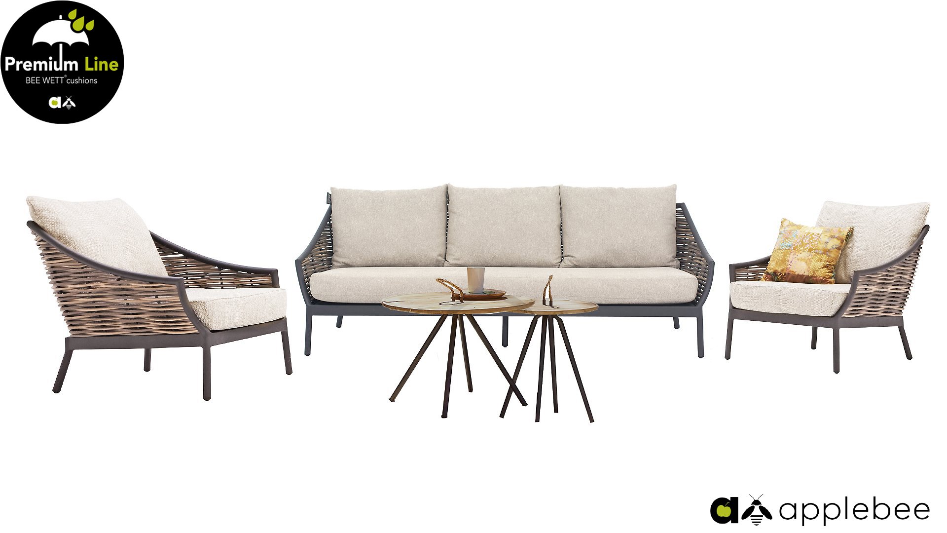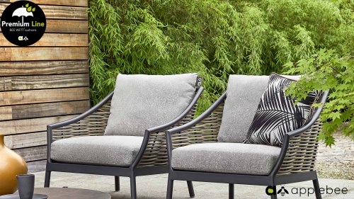 Apple Bee is characterized by the use of special Biculair® wickerwork, originally developed for professional applications in the hospitality industry. This Biculair® wickerwork is a lifelike, sustainable alternative to rattan. This highly durable synthetic rattan fiber (HDPE) is completely weatherproof, colorfast, recyclable, and therefore an environmentally friendly choice. The appearance and performance of the furniture remain unaffected by European weather conditions, and the colors retain their natural vibrancy. The superior quality of this wickerwork, verified by the Netherlands Organisation for Applied Scientific Research (TNO), is clearly demonstrated compared to other comparable materials.
