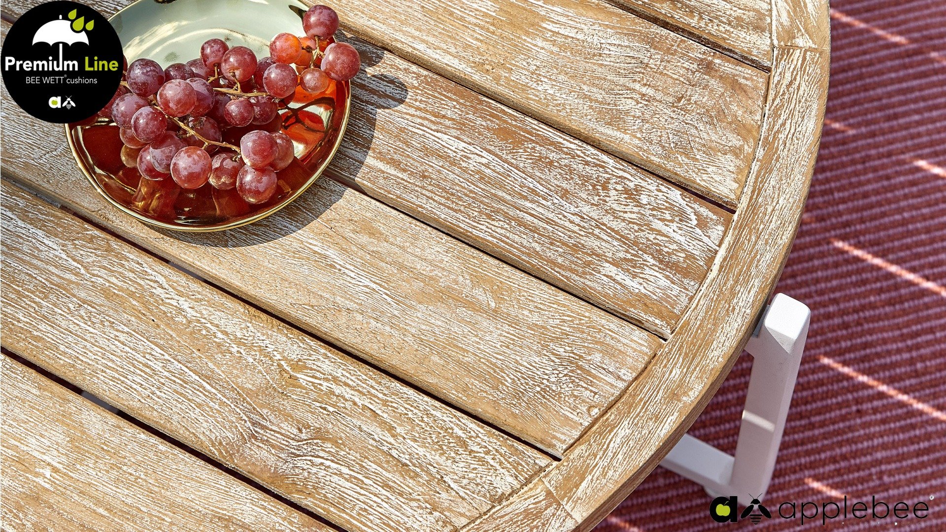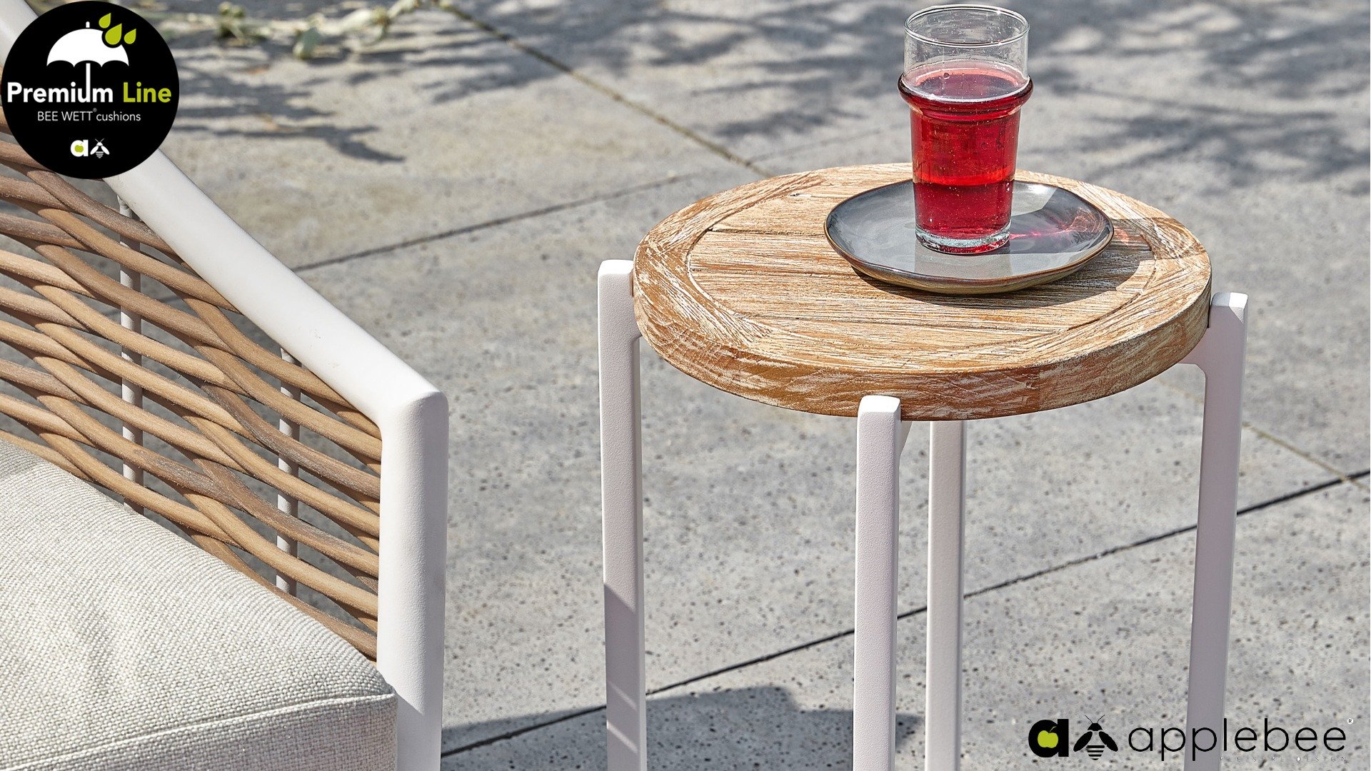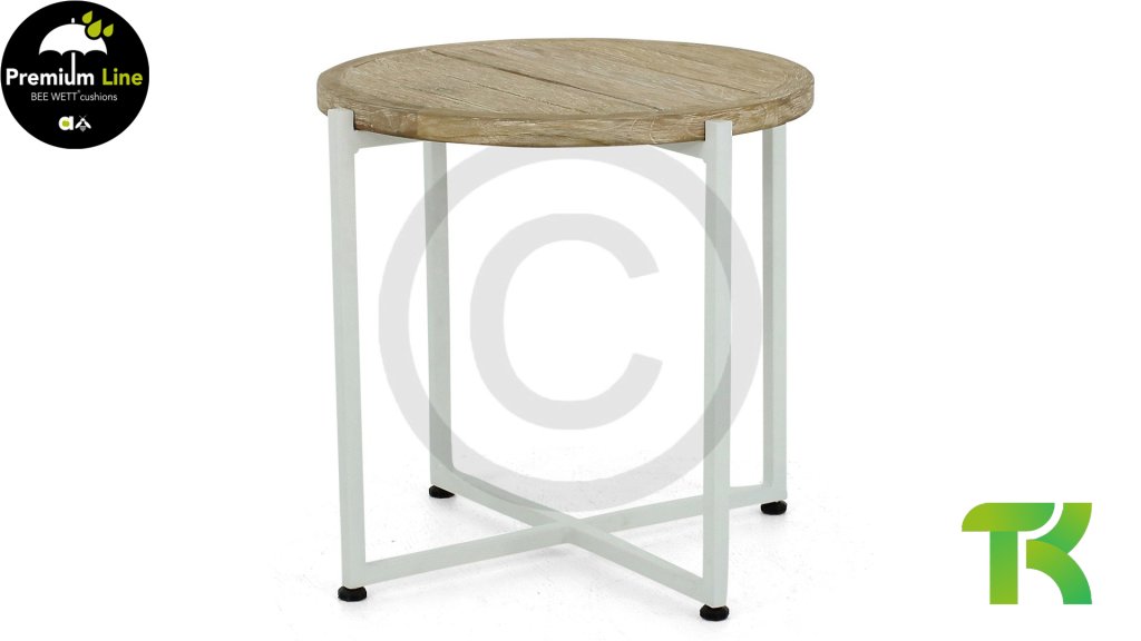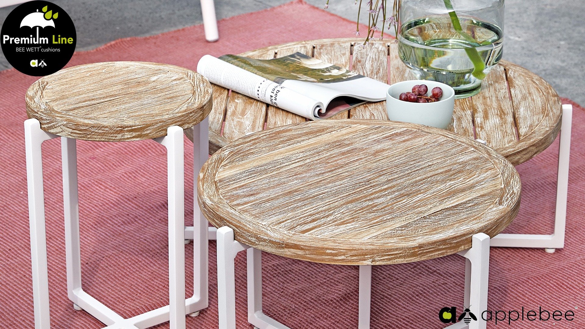 Milou coffee tables come in 3 sizes: 34, 54, 74 centimeters in diameter. The heights vary, making these tables ideal for combining as a set. The teak wood is treated with a white wash and the leg frame is powder-coated aluminum. So, maintenance-free.