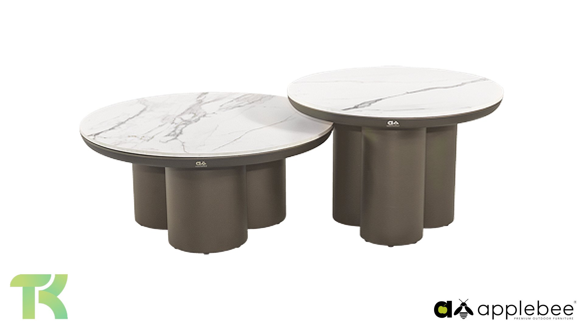 Discover the Apple Bee Tonga coffee table set, the perfect combination of a robust look and modern luxury. This set, consisting of two tables (Ø80x36cm and Ø60x44cm), adds depth and dynamism to any lounge area. The high-quality Sintered Stone tops are not only beautiful but also durable, scratch-resistant, and weather-resistant. The tables rest on a solid powder-coated aluminum base.