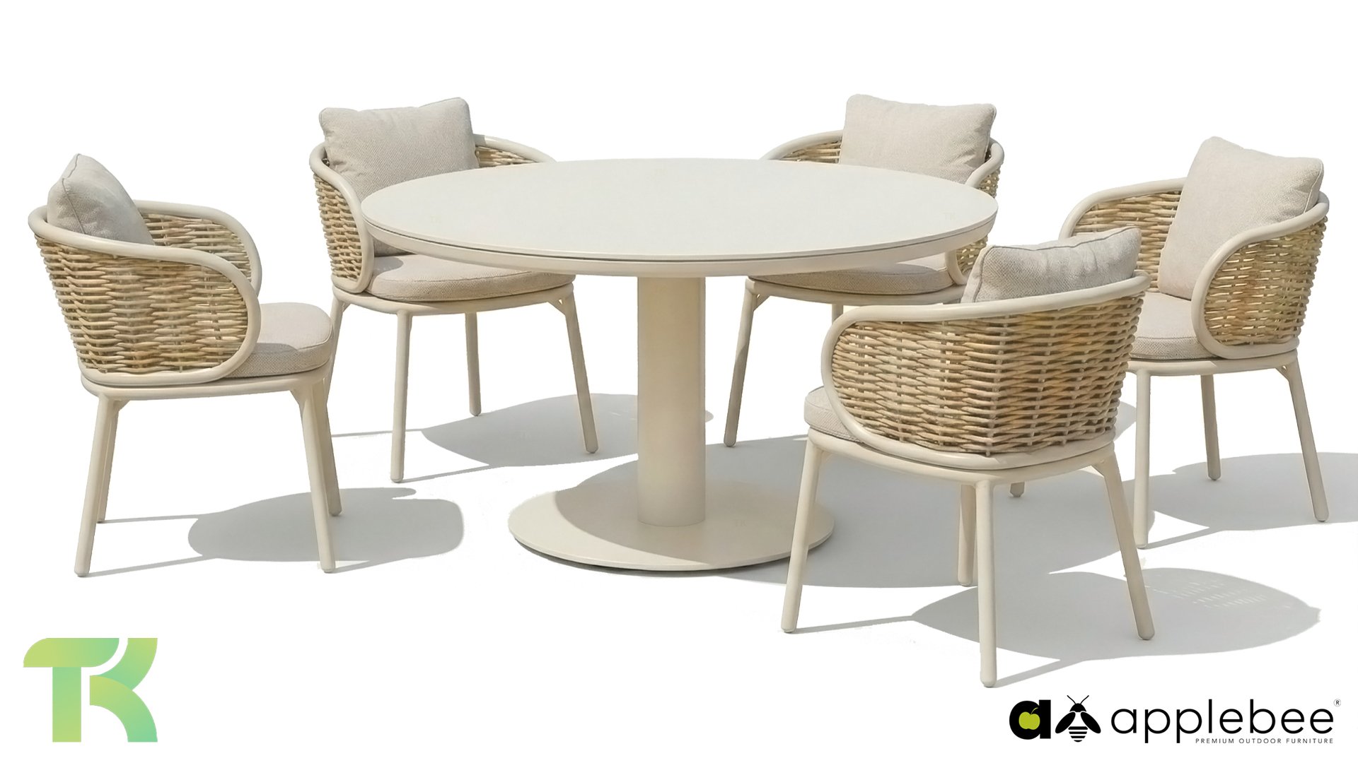 Apple Bee is characterized by the use of special Biculair® wickerwork, originally developed for professional applications in the hospitality industry. This Biculair® wickerwork is a lifelike, sustainable alternative to rattan. This highly durable synthetic rattan fiber (HDPE) is completely weatherproof, colorfast, recyclable, and therefore an environmentally friendly choice. The appearance and performance of the furniture remain unaffected by European weather conditions, and the colors retain their natural vibrancy. The superior quality of this wickerwork, verified by the Netherlands Organisation for Applied Scientific Research (TNO), is clearly demonstrated compared to other comparable materials.