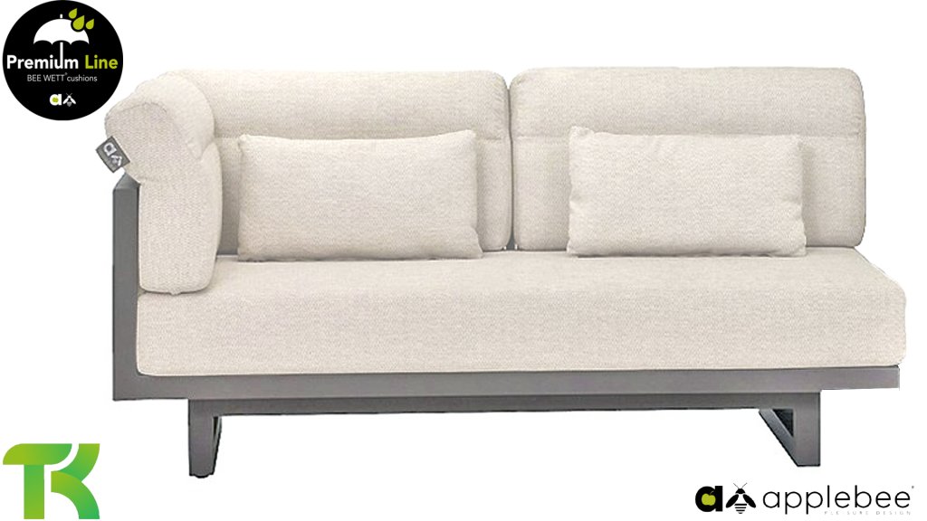 Apple Bee Santorini Lounge: If you love a sleek and cubic lounge set but don’t want to compromise on individuality… here it is, the Santorini! A sleek, aluminum square tube frame, powder-coated in warm taupe. This set comes in two versions. The difference lies in the panels on the arms and the back, which seem to be framed like a painting by the frame. In the first version, the panel is beautifully wrapped in marbled rope. This keeps the set airy with a contemporary look. The other version has upholstered panels in the same fabric as the cushions. This immediately gives the set more class and luxury.