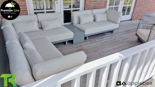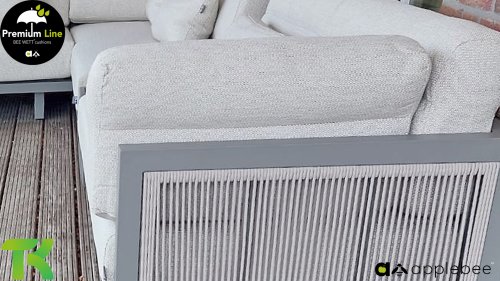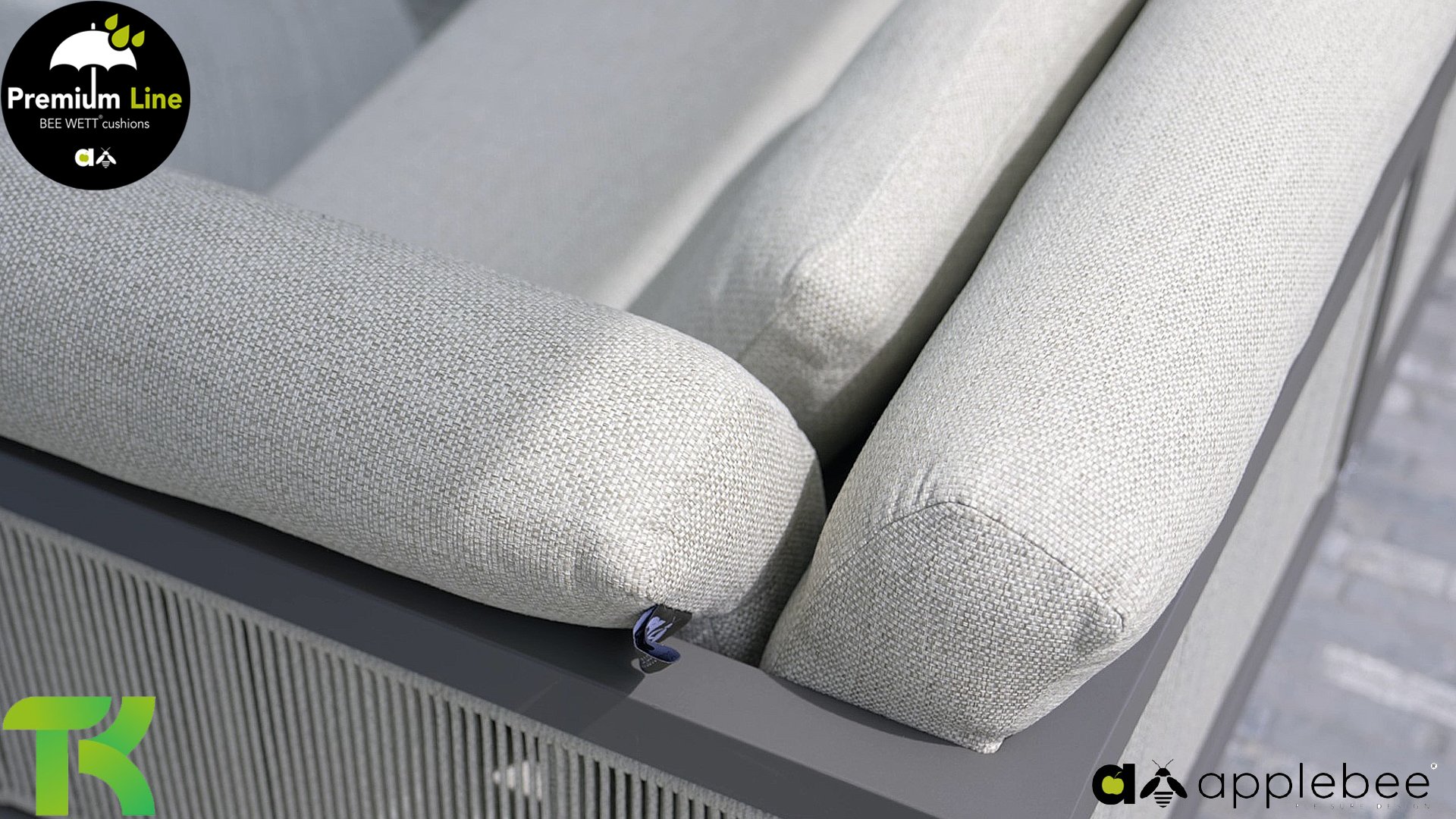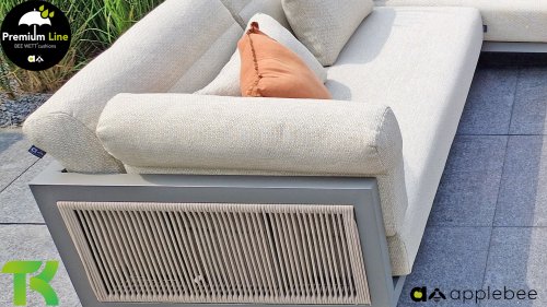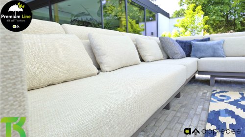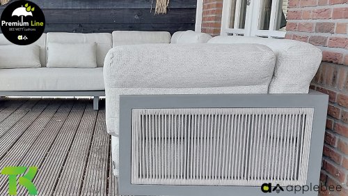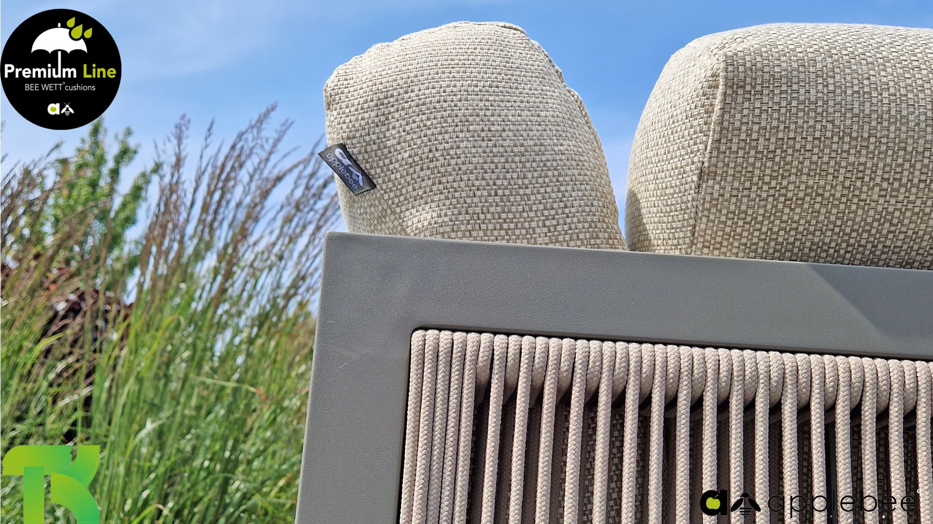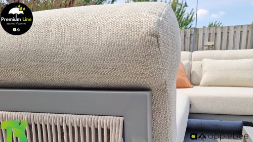 Apple Bee Santorini Lounge Rope: If you love a sleek and cubic lounge set, but do not want to compromise on individuality… here is the Santorini! A sleek, aluminum square tube frame, powder-coated in warm taupe. This set comes in two versions. The difference lies in the panels on the arms and back, which seem to be framed by the structure like a painting. In the first version, the panel is beautifully wrapped in marbled rope. This gives the set a lightness with a contemporary look. The other version features upholstered panels in the same fabric as the cushions. This immediately gives the set more class and luxury.