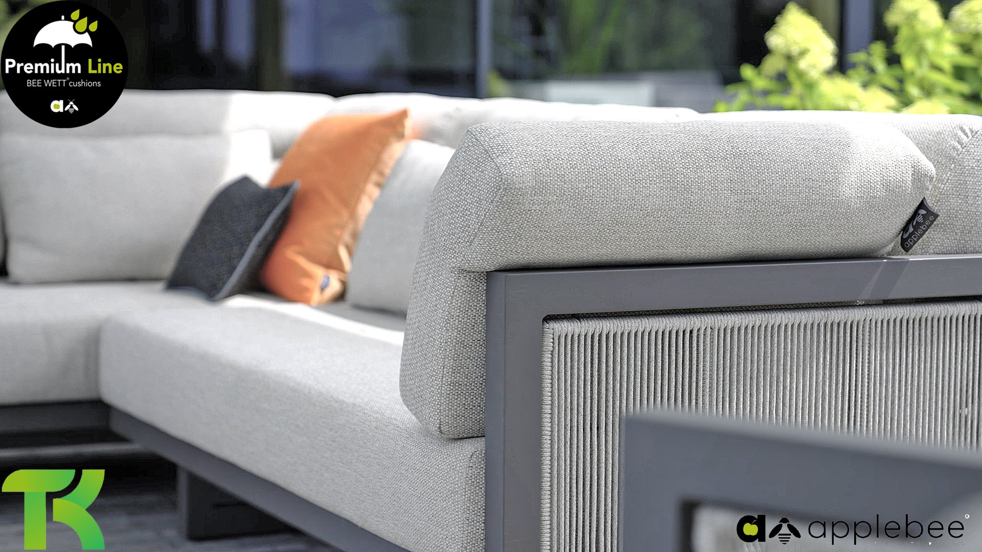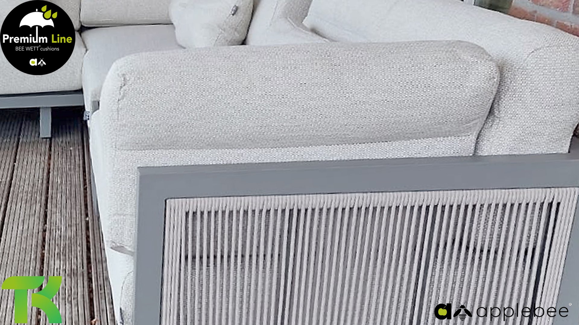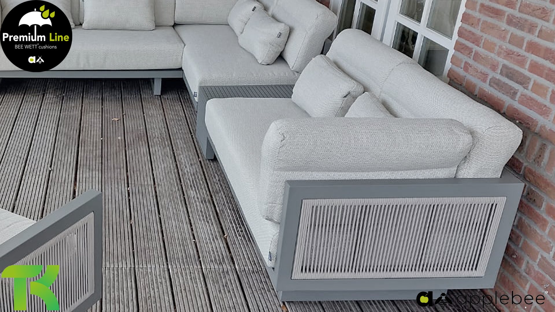Apple Bee Santorini Lounge Rope: If you love a sleek and cubic lounge set, but do not want to compromise on individuality… here is the Santorini! A sleek, aluminum square tube frame, powder-coated in warm taupe. This set comes in two versions. The difference lies in the panels on the arms and back, which seem to be framed by the structure like a painting. In the first version, the panel is beautifully wrapped in marbled rope. This gives the set a lightness with a contemporary look. The other version features upholstered panels in the same fabric as the cushions. This immediately gives the set more class and luxury.