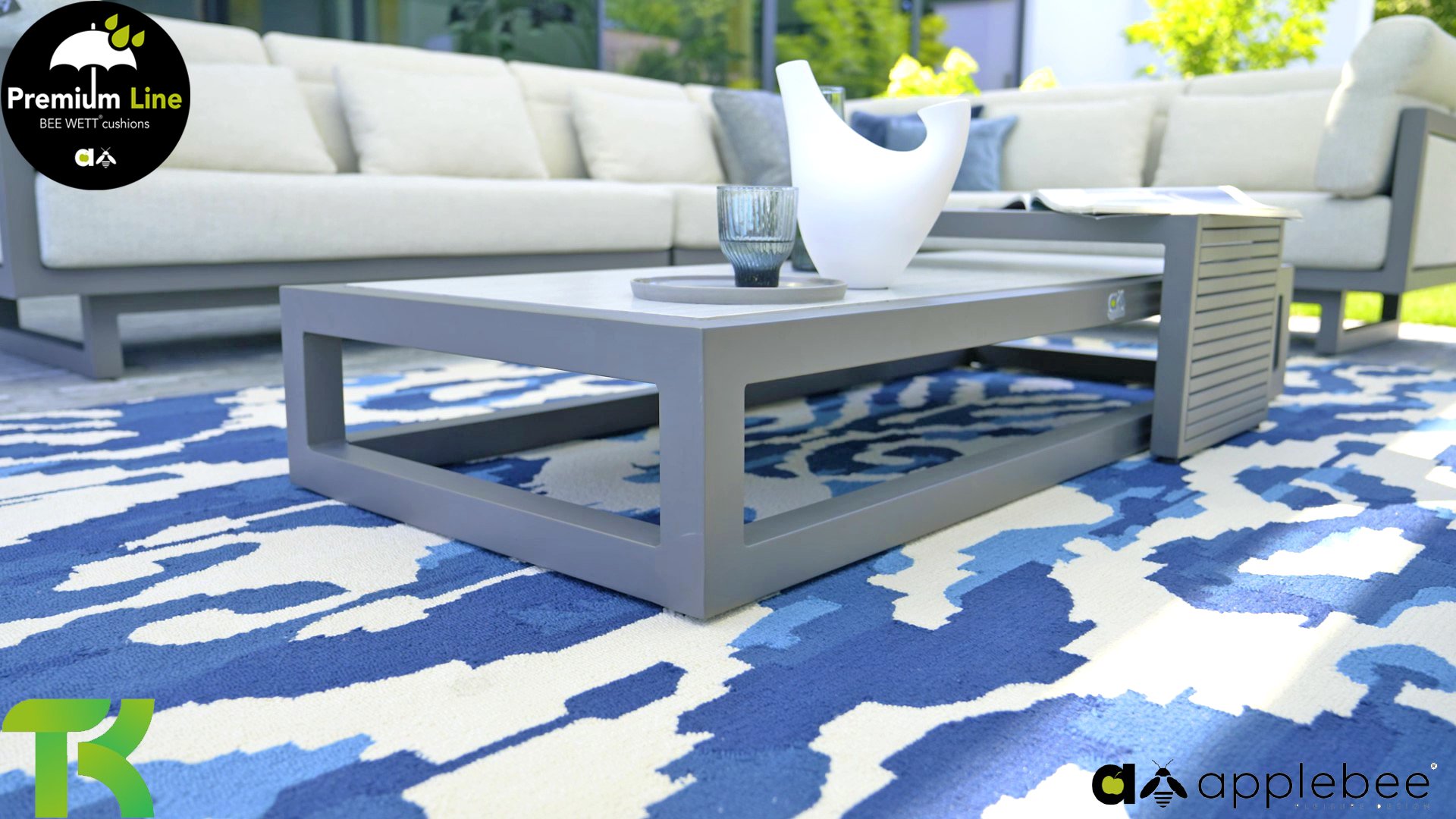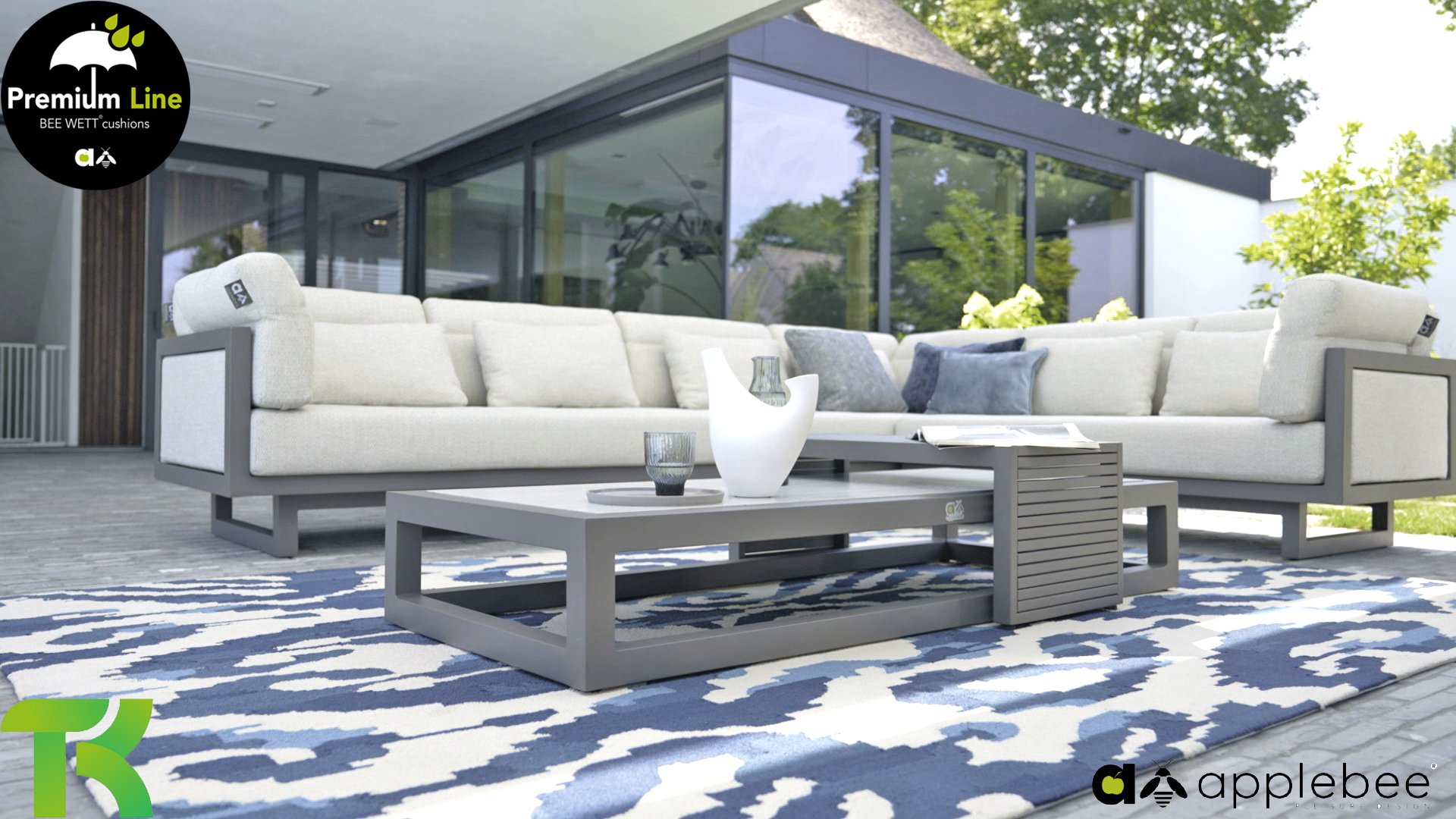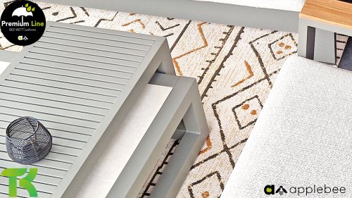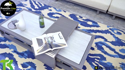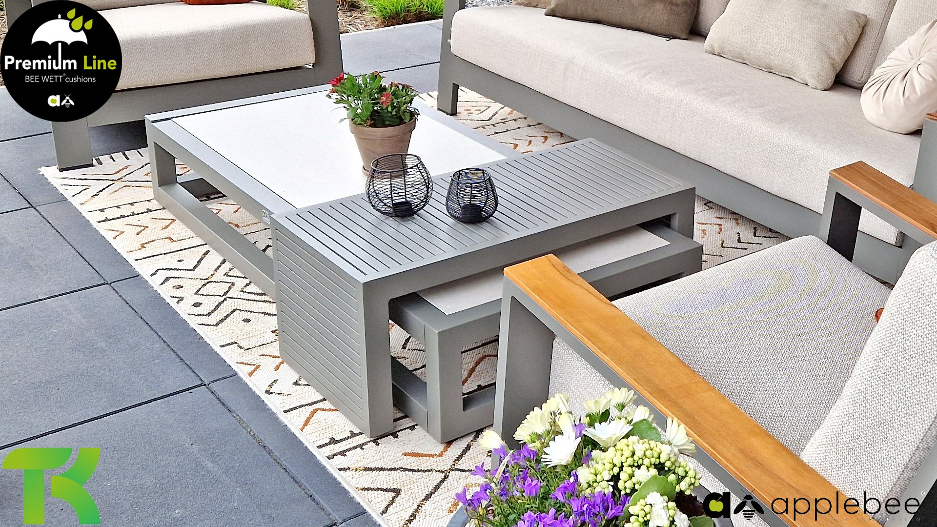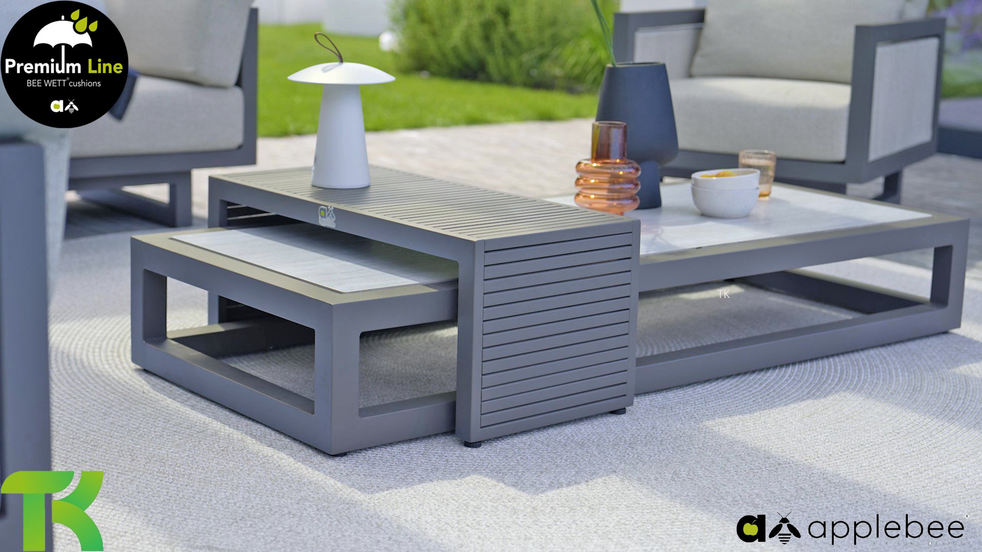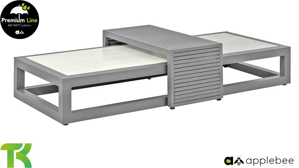 The AppleBee Santorini Coffee Table Set, with an aluminum base in the color Quartz. The top of the 155cm table is ceramic in the color Travertine. It is an elegant combination, especially with the AppleBee Santorini Lounge Set!