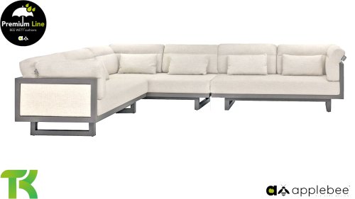 Apple Bee Santorini Lounge: If you love a sleek and cubic lounge set but don’t want to compromise on individuality… here it is, the Santorini! A sleek, aluminum square tube frame, powder-coated in warm taupe. This set comes in two versions. The difference lies in the panels on the arms and the back, which seem to be framed like a painting by the frame. In the first version, the panel is beautifully wrapped in marbled rope. This keeps the set airy with a contemporary look. The other version has upholstered panels in the same fabric as the cushions. This immediately gives the set more class and luxury.