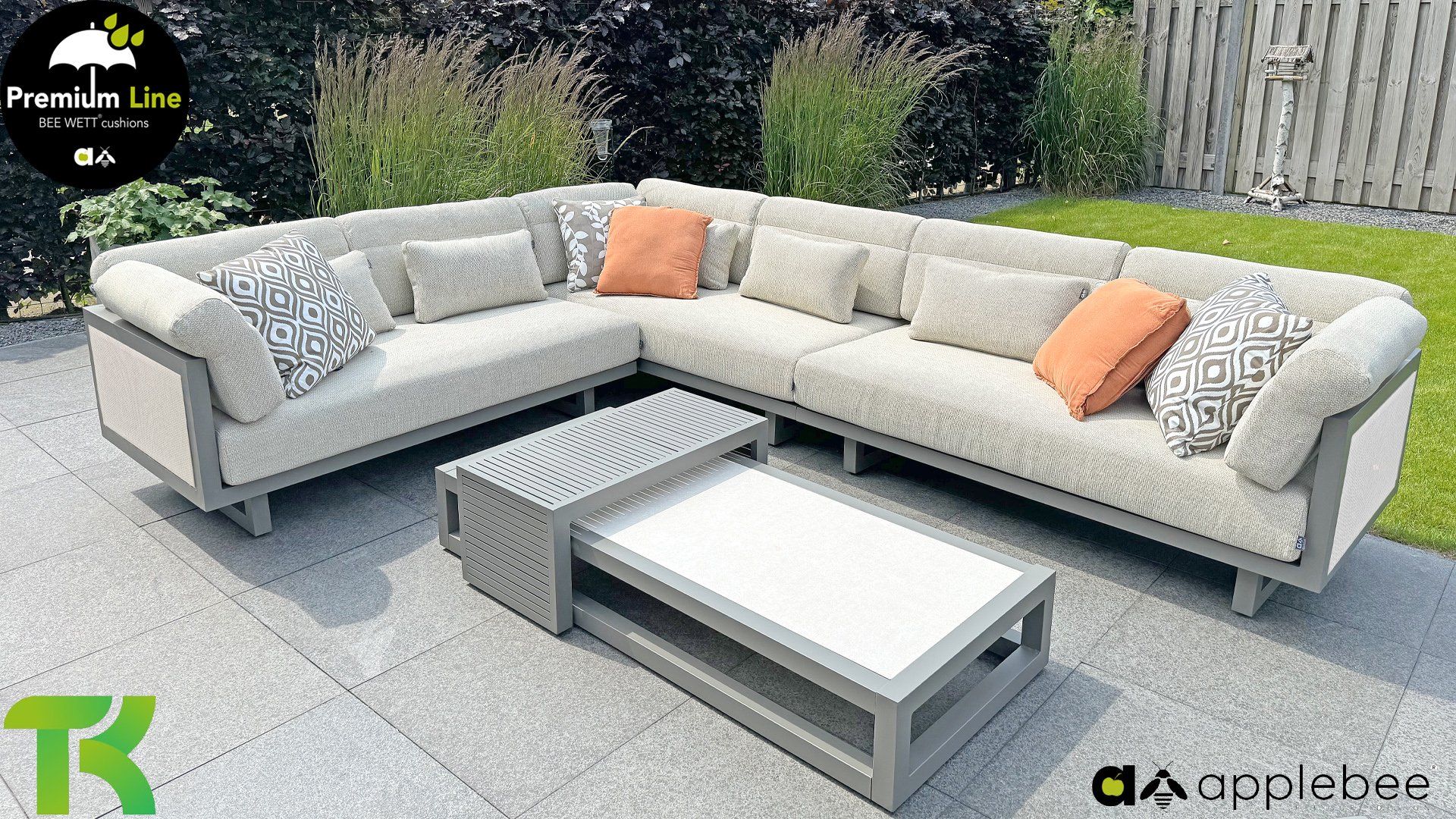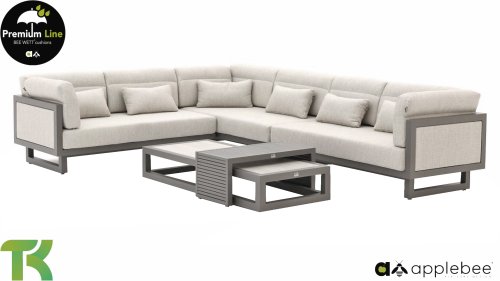 Apple Bee Santorini Lounge: If you love a sleek and cubic lounge set but don’t want to compromise on individuality… here it is, the Santorini! A sleek, aluminum square tube frame, powder-coated in warm taupe. This set comes in two versions. The difference lies in the panels on the arms and the back, which seem to be framed like a painting by the frame. In the first version, the panel is beautifully wrapped in marbled rope. This keeps the set airy with a contemporary look. The other version has upholstered panels in the same fabric as the cushions. This immediately gives the set more class and luxury.