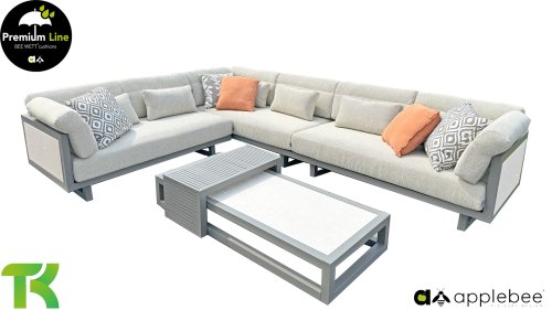 The Apple Bee Santorini Coffee Table Set, with an aluminum base in the color Quartz. The top of the 155cm table is ceramic in the color Travetino. It is an elegant combination, especially with the Apple Bee Santorini Lounge Set!