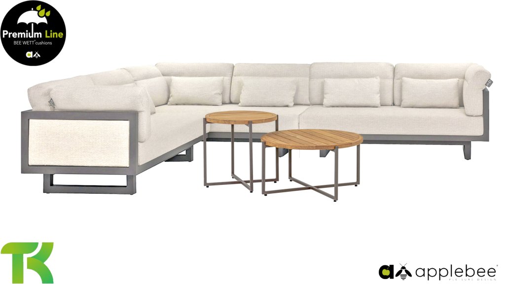 Apple Bee Santorini Lounge: If you love a sleek and cubic lounge set but don’t want to compromise on individuality… here it is, the Santorini! A sleek, aluminum square tube frame, powder-coated in warm taupe. This set comes in two versions. The difference lies in the panels on the arms and the back, which seem to be framed like a painting by the frame. In the first version, the panel is beautifully wrapped in marbled rope. This keeps the set airy with a contemporary look. The other version has upholstered panels in the same fabric as the cushions. This immediately gives the set more class and luxury.
