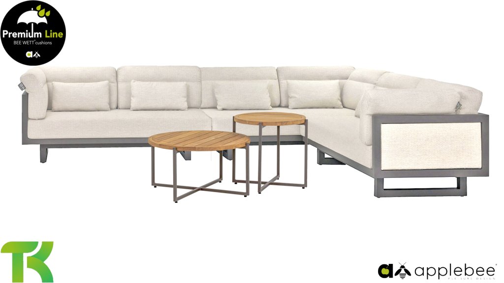 Apple Bee Santorini Lounge: If you love a sleek and cubic lounge set but don’t want to compromise on individuality… here it is, the Santorini! A sleek, aluminum square tube frame, powder-coated in warm taupe. This set comes in two versions. The difference lies in the panels on the arms and the back, which seem to be framed like a painting by the frame. In the first version, the panel is beautifully wrapped in marbled rope. This keeps the set airy with a contemporary look. The other version has upholstered panels in the same fabric as the cushions. This immediately gives the set more class and luxury.