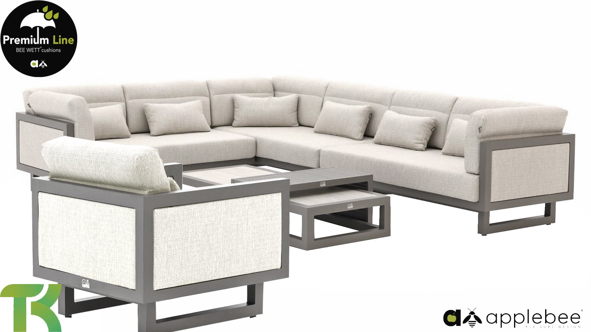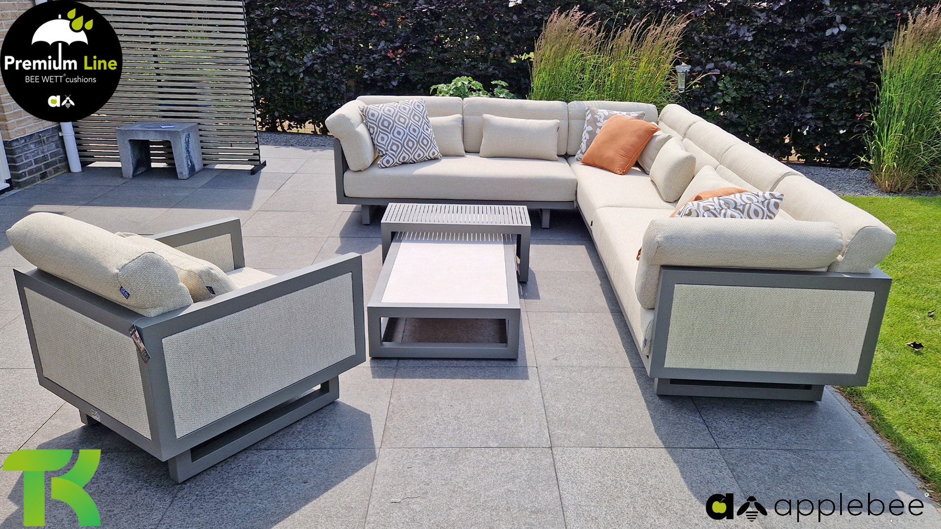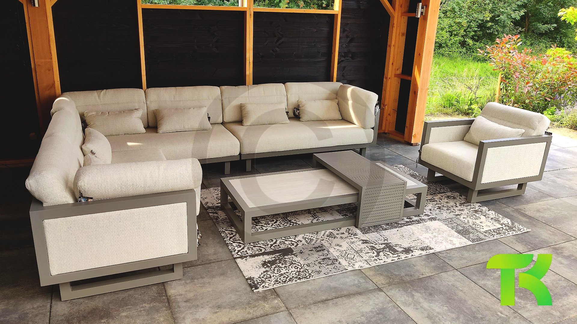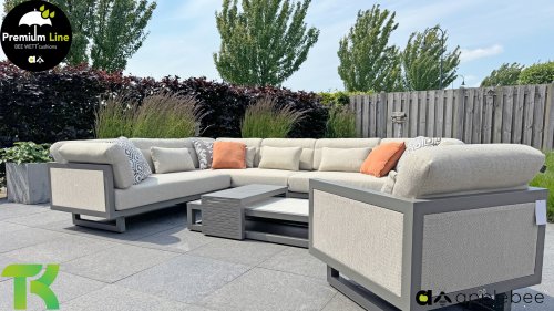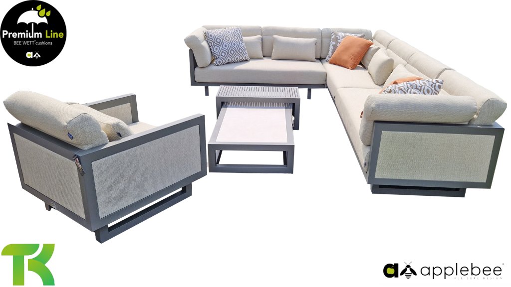 Apple Bee Santorini Lounge: If you love a sleek and cubic lounge set but don’t want to compromise on individuality… here it is, the Santorini! A sleek, aluminum square tube frame, powder-coated in warm taupe. This set comes in two versions. The difference lies in the panels on the arms and the back, which seem to be framed like a painting by the frame. In the first version, the panel is beautifully wrapped in marbled rope. This keeps the set airy with a contemporary look. The other version has upholstered panels in the same fabric as the cushions. This immediately gives the set more class and luxury.