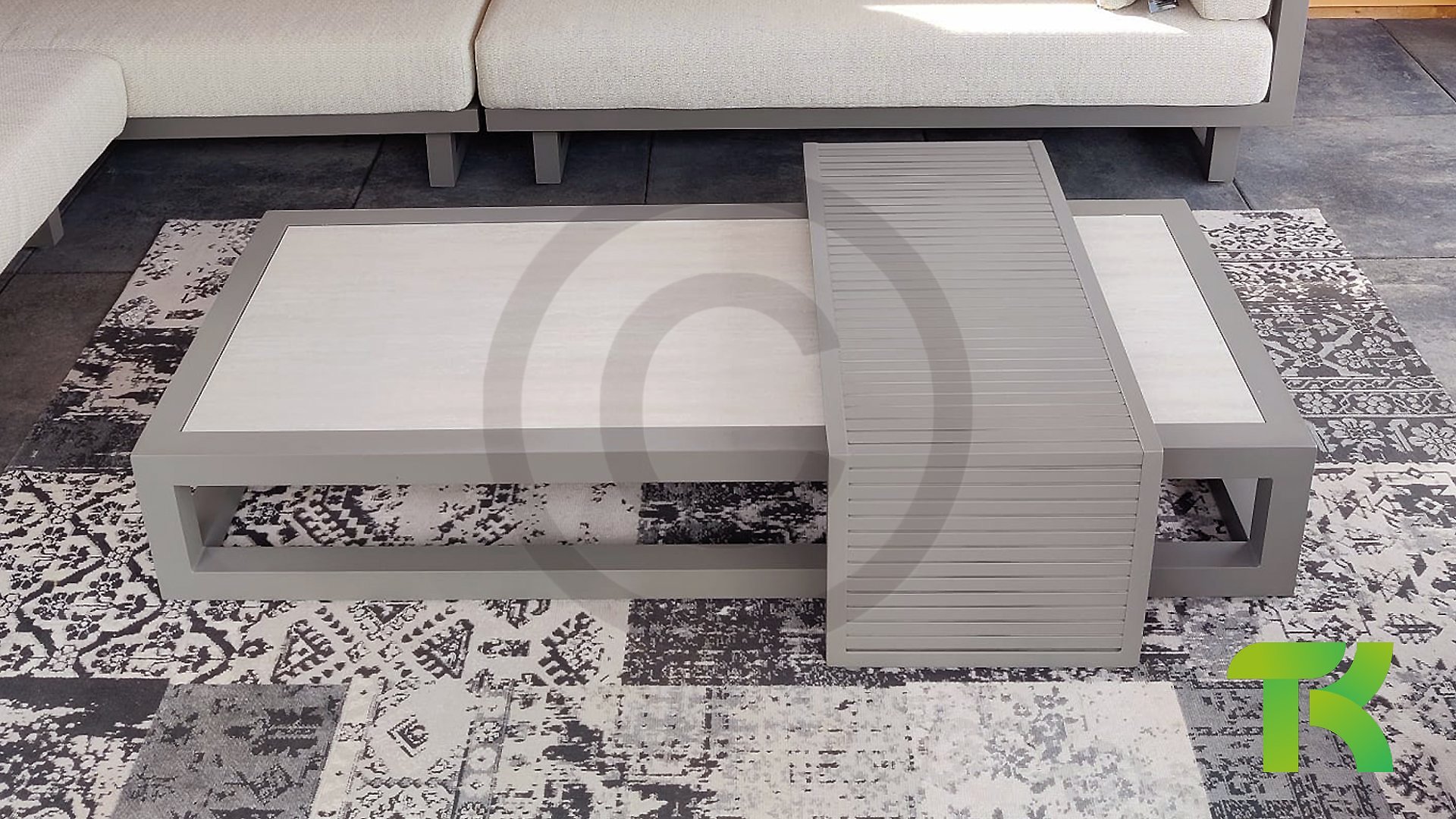 The Apple Bee Santorini Coffee Table Set, with an aluminum base in the color Quartz. The top of the 155cm table is ceramic in the color Travetino. It is an elegant combination, especially with the Apple Bee Santorini Lounge Set!