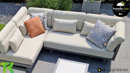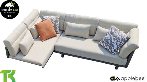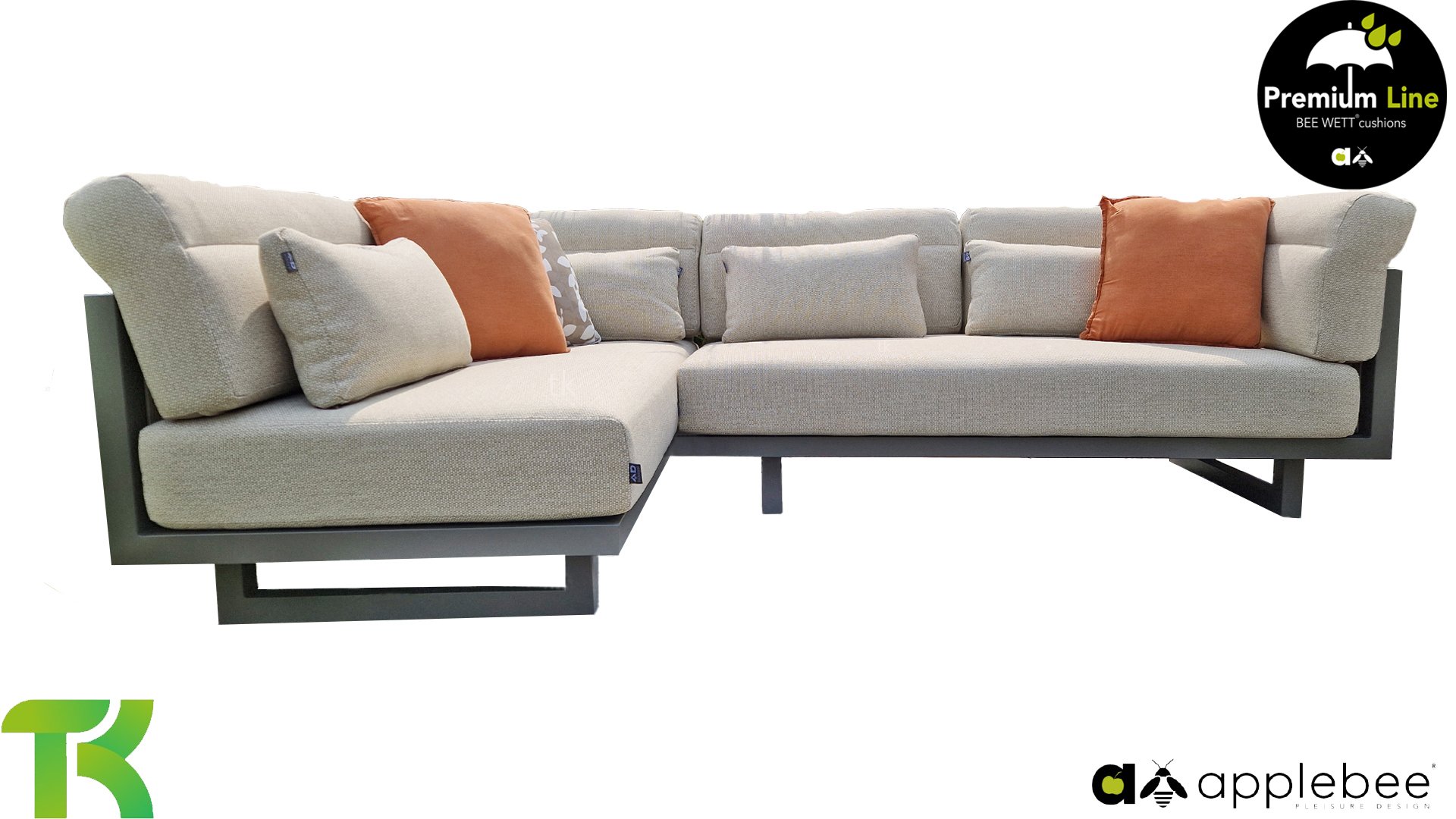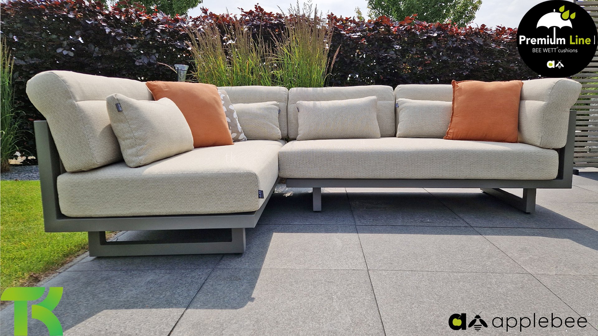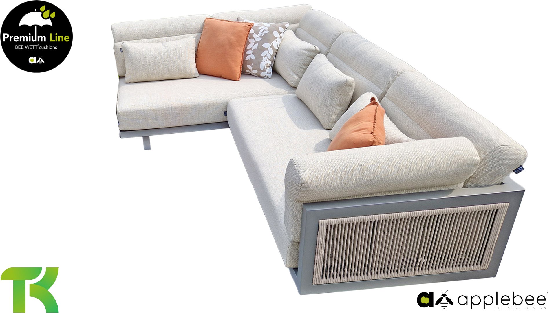 Apple Bee Santorini Lounge Rope: If you love a sleek and cubic lounge set, but do not want to compromise on individuality… here is the Santorini! A sleek, aluminum square tube frame, powder-coated in warm taupe. This set comes in two versions. The difference lies in the panels on the arms and back, which seem to be framed by the structure like a painting. In the first version, the panel is beautifully wrapped in marbled rope. This gives the set a lightness with a contemporary look. The other version features upholstered panels in the same fabric as the cushions. This immediately gives the set more class and luxury.