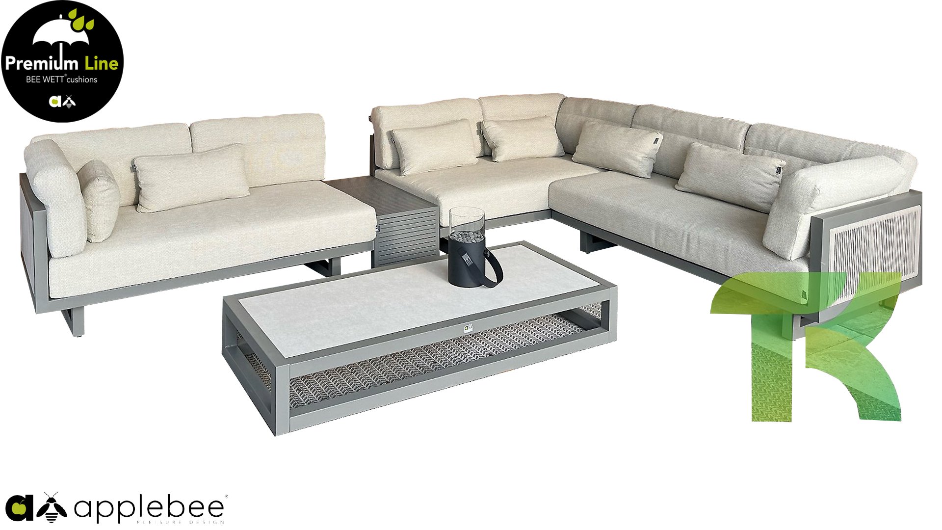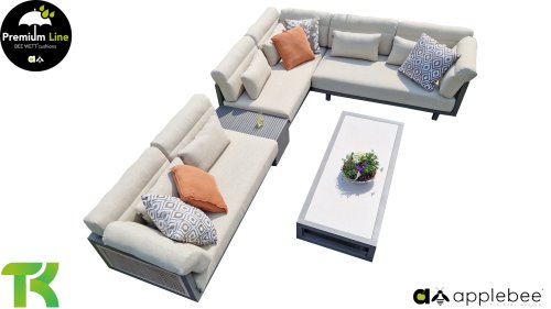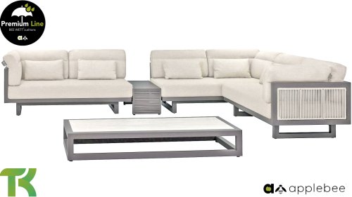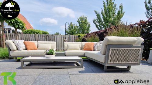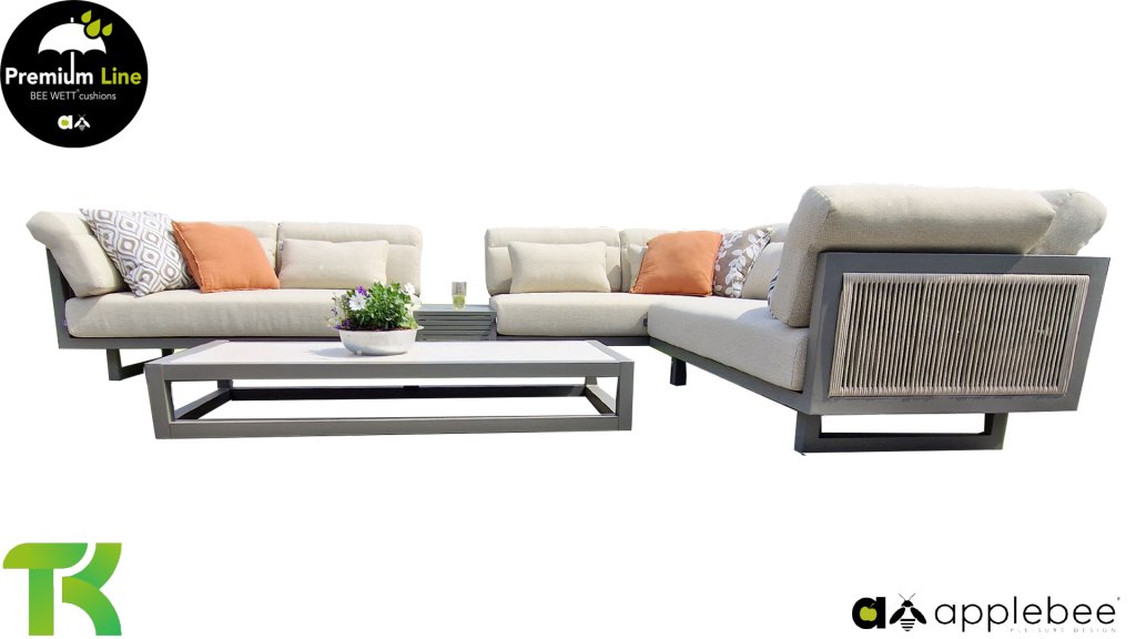 Apple Bee Santorini Lounge Rope: If you love a sleek and cubic lounge set, but do not want to compromise on individuality… here is the Santorini! A sleek, aluminum square tube frame, powder-coated in warm taupe. This set comes in two versions. The difference lies in the panels on the arms and back, which seem to be framed by the structure like a painting. In the first version, the panel is beautifully wrapped in marbled rope. This gives the set a lightness with a contemporary look. The other version features upholstered panels in the same fabric as the cushions. This immediately gives the set more class and luxury.