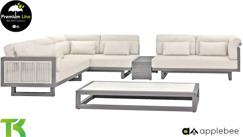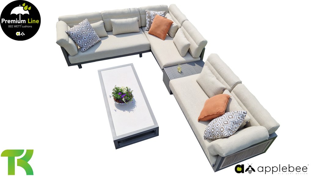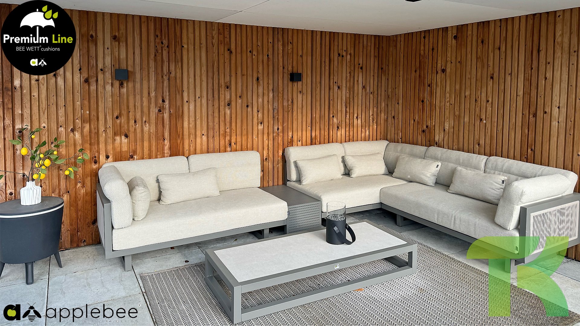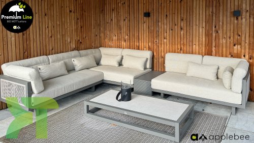 Apple Bee Santorini Lounge Rope: If you love a sleek and cubic lounge set, but do not want to compromise on individuality… here is the Santorini! A sleek, aluminum square tube frame, powder-coated in warm taupe. This set comes in two versions. The difference lies in the panels on the arms and back, which seem to be framed by the structure like a painting. In the first version, the panel is beautifully wrapped in marbled rope. This gives the set a lightness with a contemporary look. The other version features upholstered panels in the same fabric as the cushions. This immediately gives the set more class and luxury.