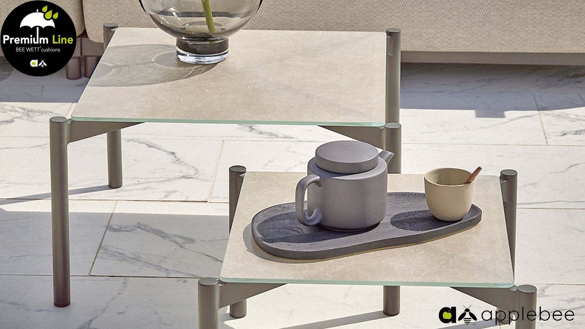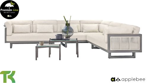Apple Bee Santorini Lounge Rope: If you love a sleek and cubic lounge set, but do not want to compromise on individuality… here is the Santorini! A sleek, aluminum square tube frame, powder-coated in warm taupe. This set comes in two versions. The difference lies in the panels on the arms and back, which seem to be framed by the structure like a painting. In the first version, the panel is beautifully wrapped in marbled rope. This gives the set a lightness with a contemporary look. The other version features upholstered panels in the same fabric as the cushions. This immediately gives the set more class and luxury.