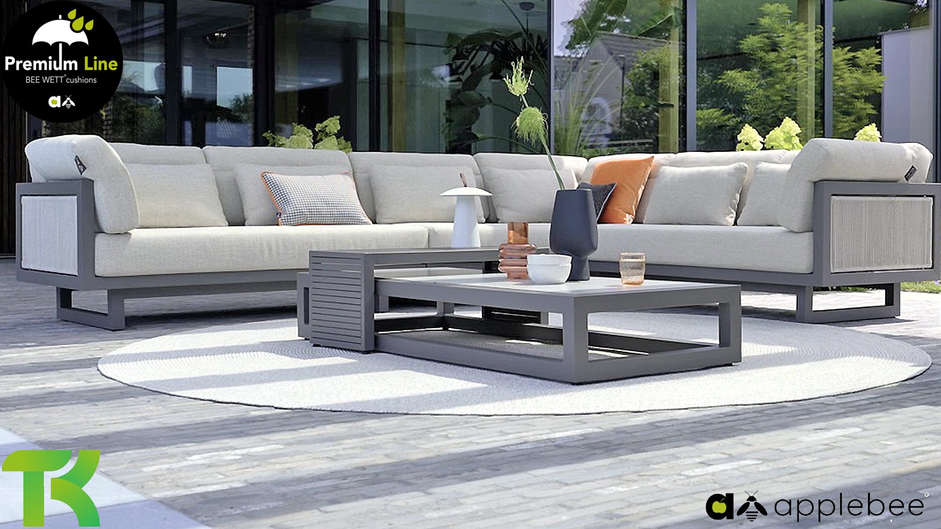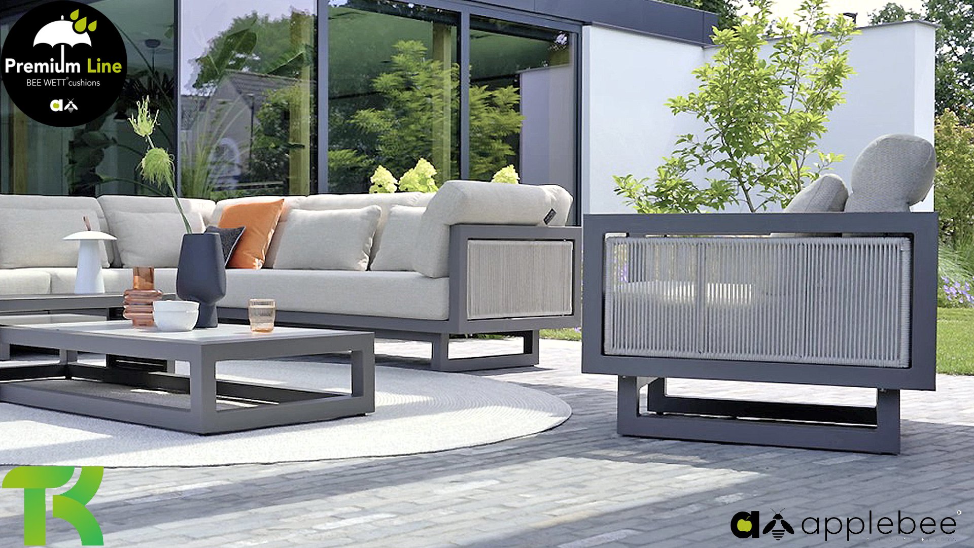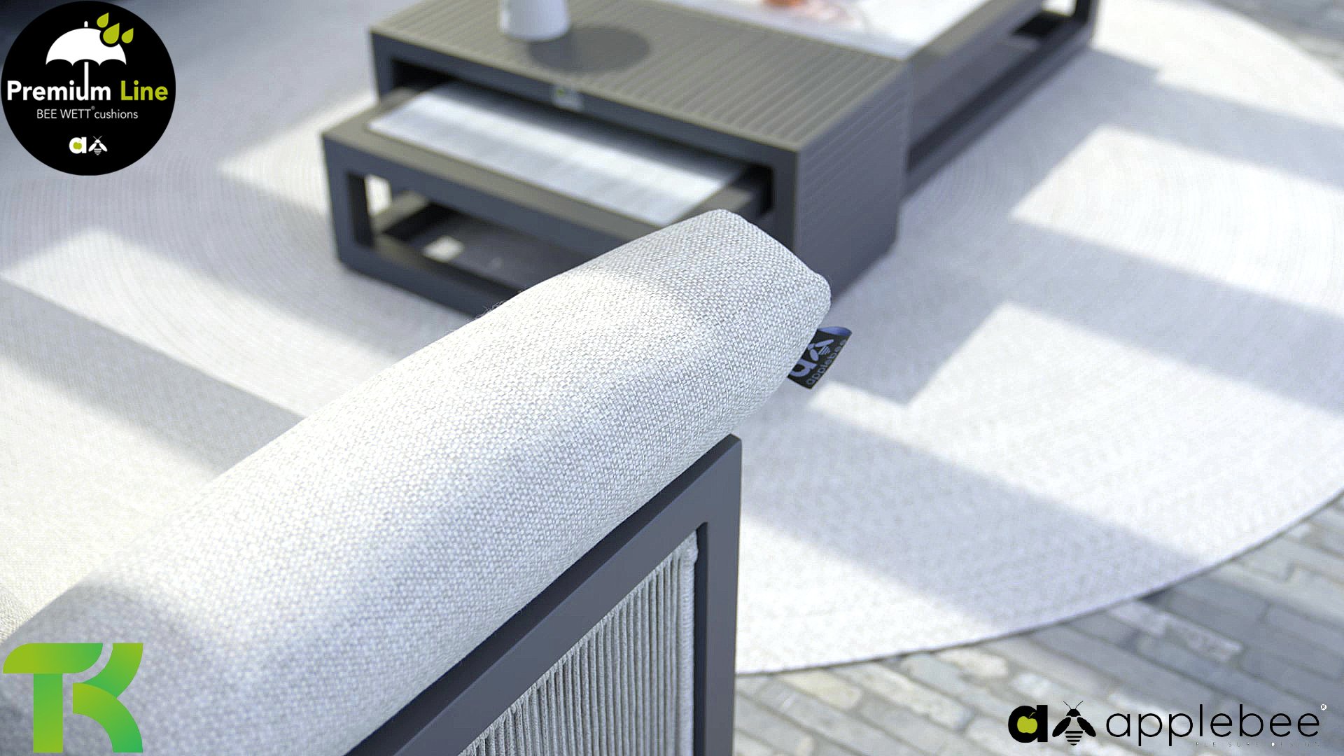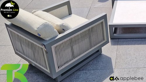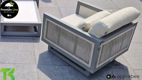 Apple Bee Santorini Lounge Rope: If you love a sleek and cubic lounge set, but do not want to compromise on individuality… here is the Santorini! A sleek, aluminum square tube frame, powder-coated in warm taupe. This set comes in two versions. The difference lies in the panels on the arms and back, which seem to be framed by the structure like a painting. In the first version, the panel is beautifully wrapped in marbled rope. This gives the set a lightness with a contemporary look. The other version features upholstered panels in the same fabric as the cushions. This immediately gives the set more class and luxury.