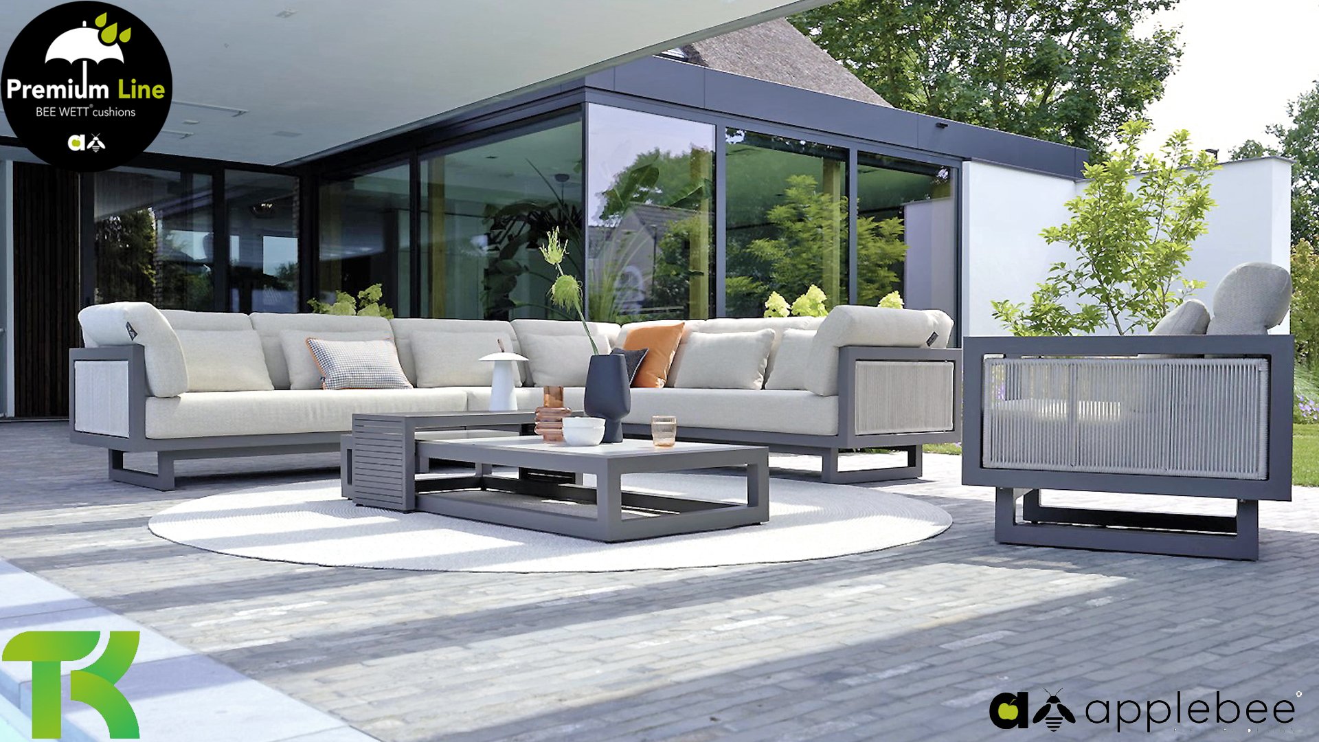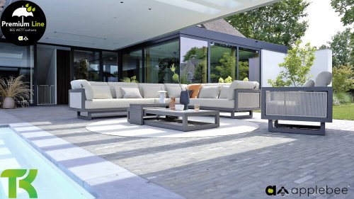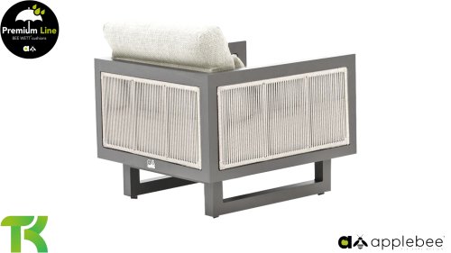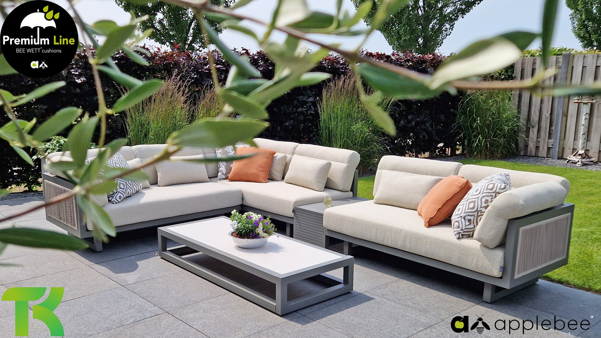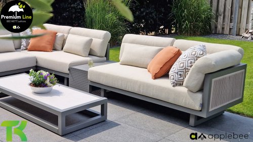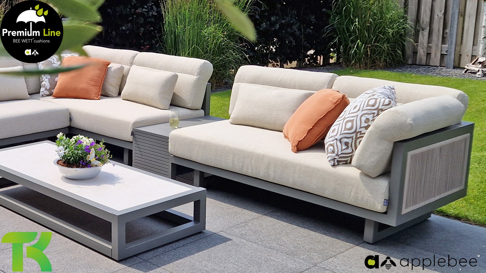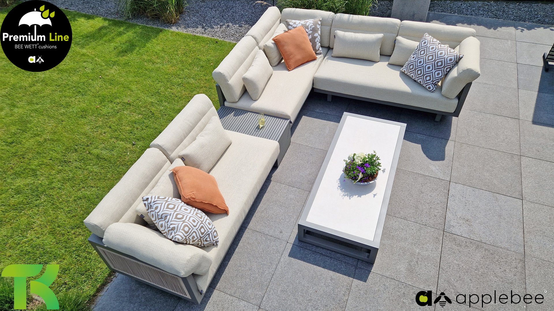 Apple Bee Santorini Lounge Rope: If you love a sleek and cubic lounge set, but do not want to compromise on individuality… here is the Santorini! A sleek, aluminum square tube frame, powder-coated in warm taupe. This set comes in two versions. The difference lies in the panels on the arms and back, which seem to be framed by the structure like a painting. In the first version, the panel is beautifully wrapped in marbled rope. This gives the set a lightness with a contemporary look. The other version features upholstered panels in the same fabric as the cushions. This immediately gives the set more class and luxury.