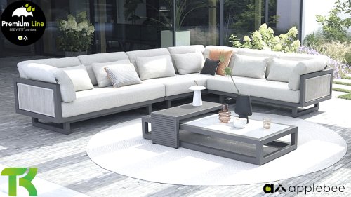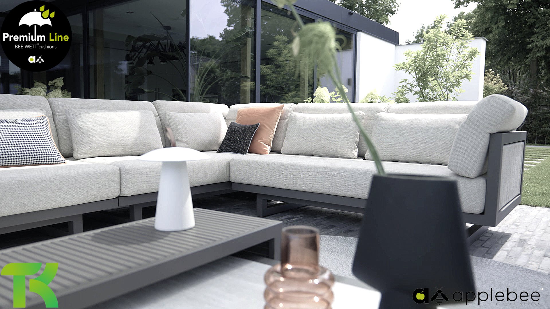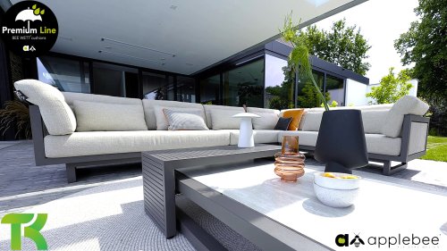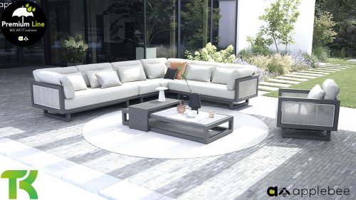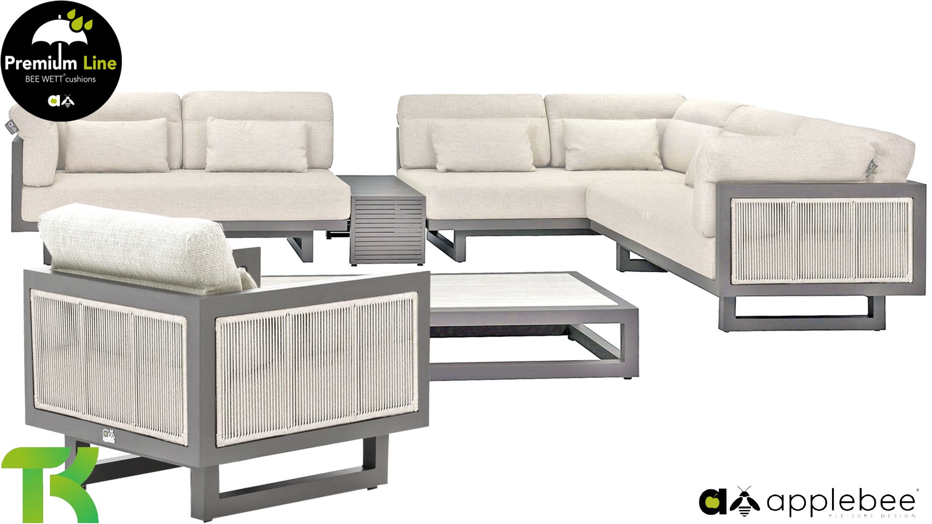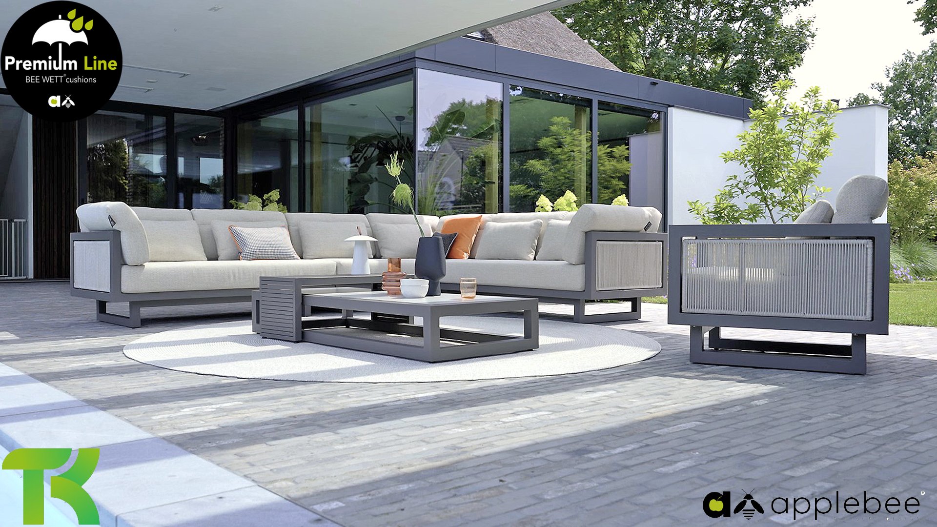 Apple Bee Santorini Lounge Rope: If you love a sleek and cubic lounge set, but do not want to compromise on individuality… here is the Santorini! A sleek, aluminum square tube frame, powder-coated in warm taupe. This set comes in two versions. The difference lies in the panels on the arms and back, which seem to be framed by the structure like a painting. In the first version, the panel is beautifully wrapped in marbled rope. This gives the set a lightness with a contemporary look. The other version features upholstered panels in the same fabric as the cushions. This immediately gives the set more class and luxury.