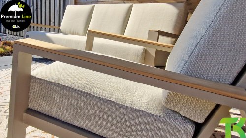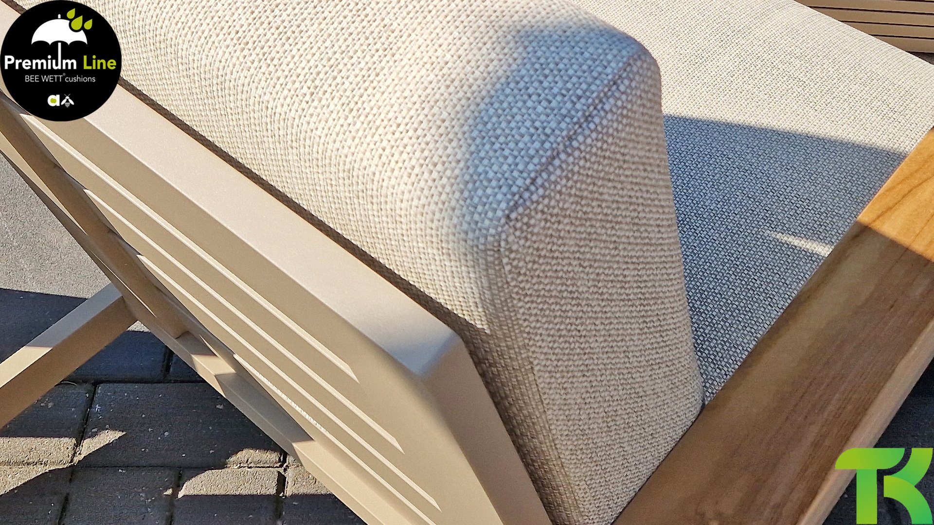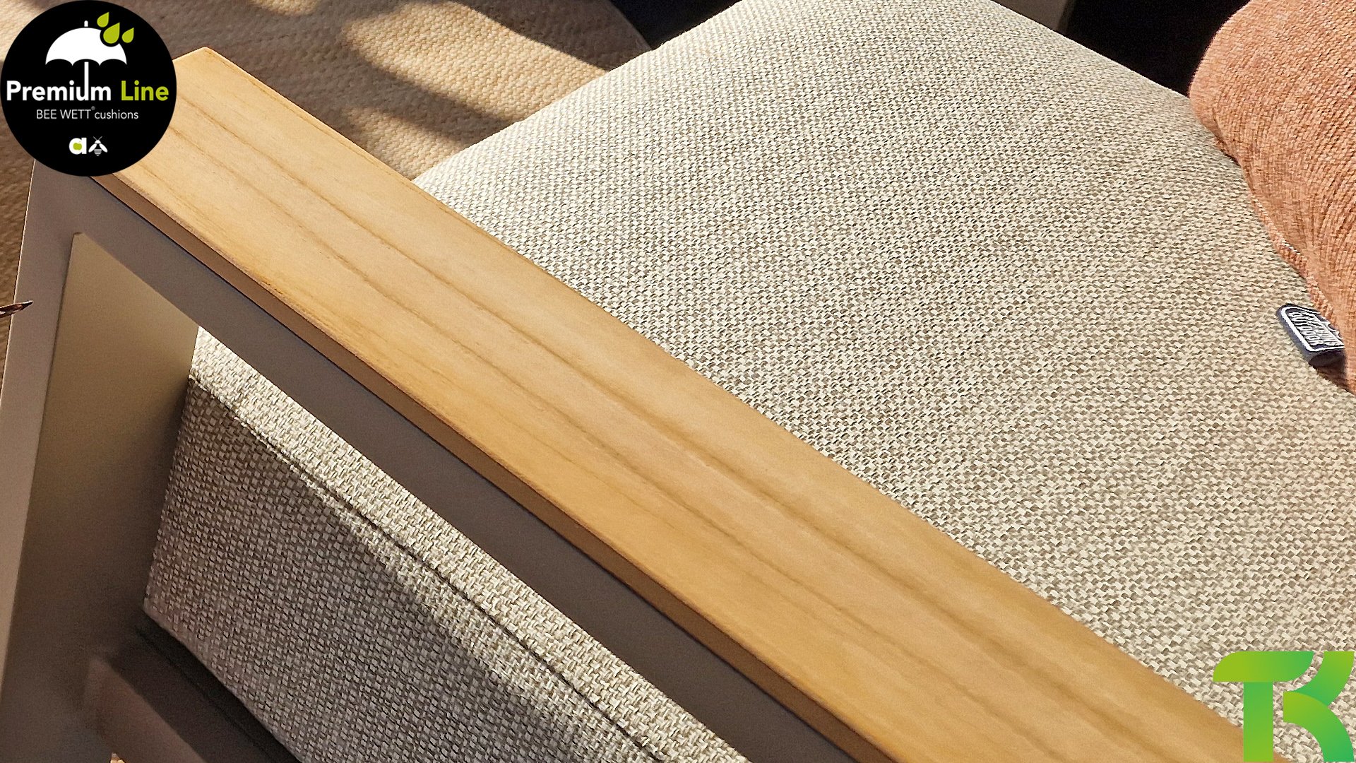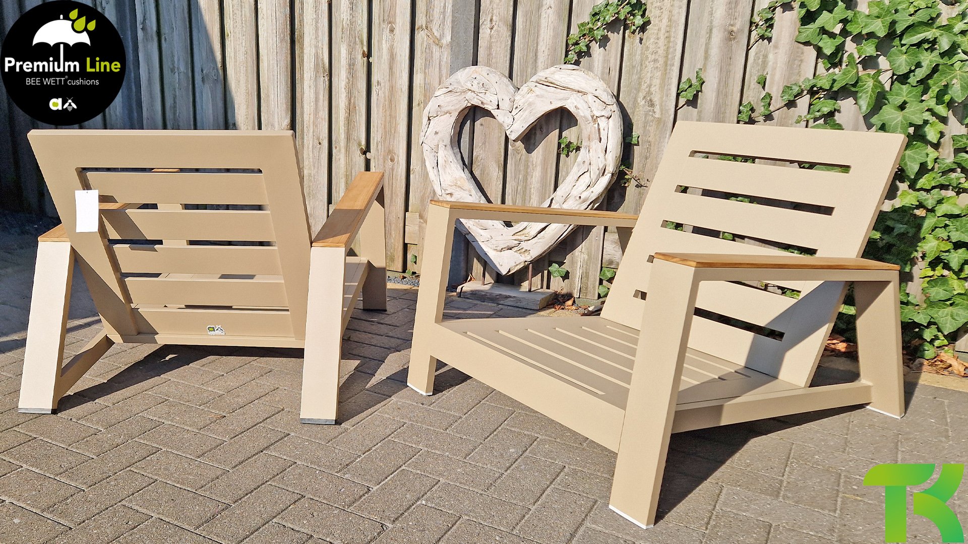 The Apple Bee Spring aluminum latte collection is minimalist and clean, but still stands out due to its unique design. A sleek diagonal play of lines, expertly processed aluminum, powder-coated in a beautiful taupe color and soft, comfortable cushions in a sandy-colored upholstery. A touch of teak on the armrest completes the set and adds that extra detail. With dressing in your own style, you can give your touch to this ‘nest in the sun’.
