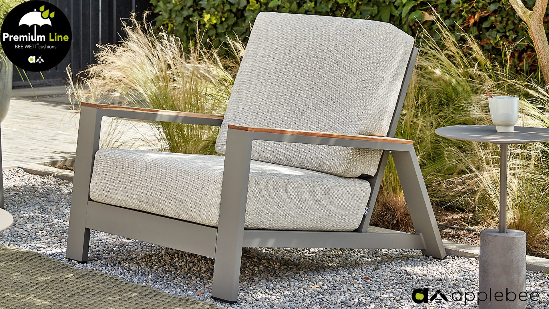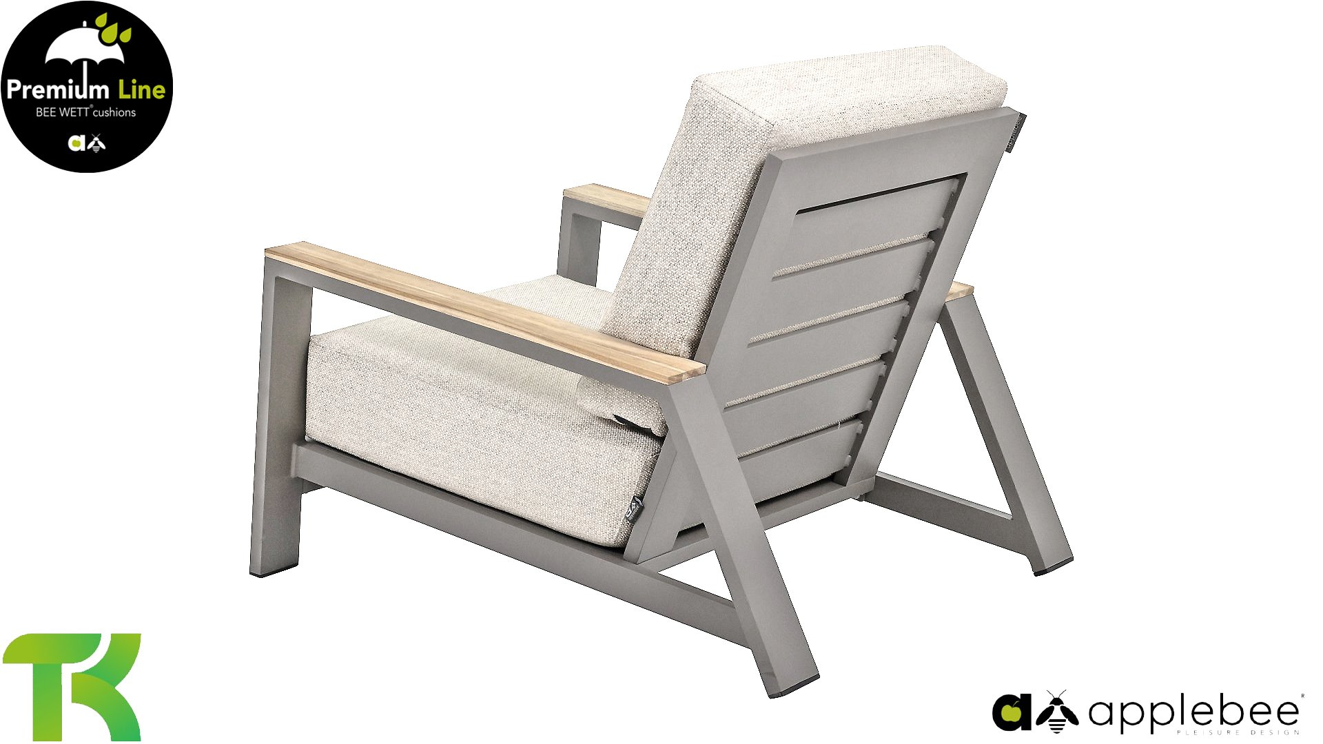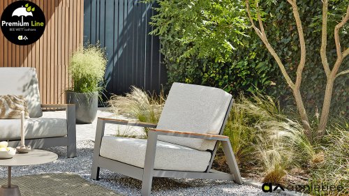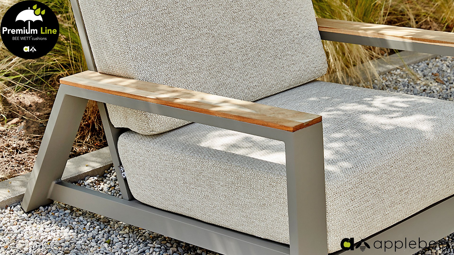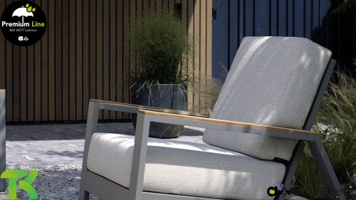 The Apple Bee Spring aluminum taupe collection is minimalist and clean, yet striking thanks to its unique design. Sleek diagonal lines, expertly crafted aluminum, powder-coated in a beautiful taupe, and soft, comfortable cushions upholstered in sand. A touch of teak on the armrest completes the set and adds that extra touch. With furnishings tailored to your own style, you can instantly add your own touch to this "nest in the sun."