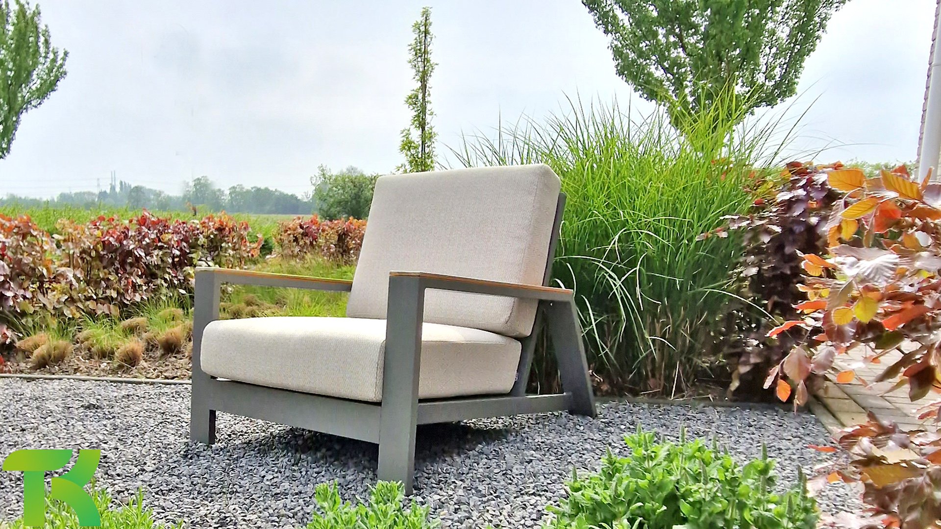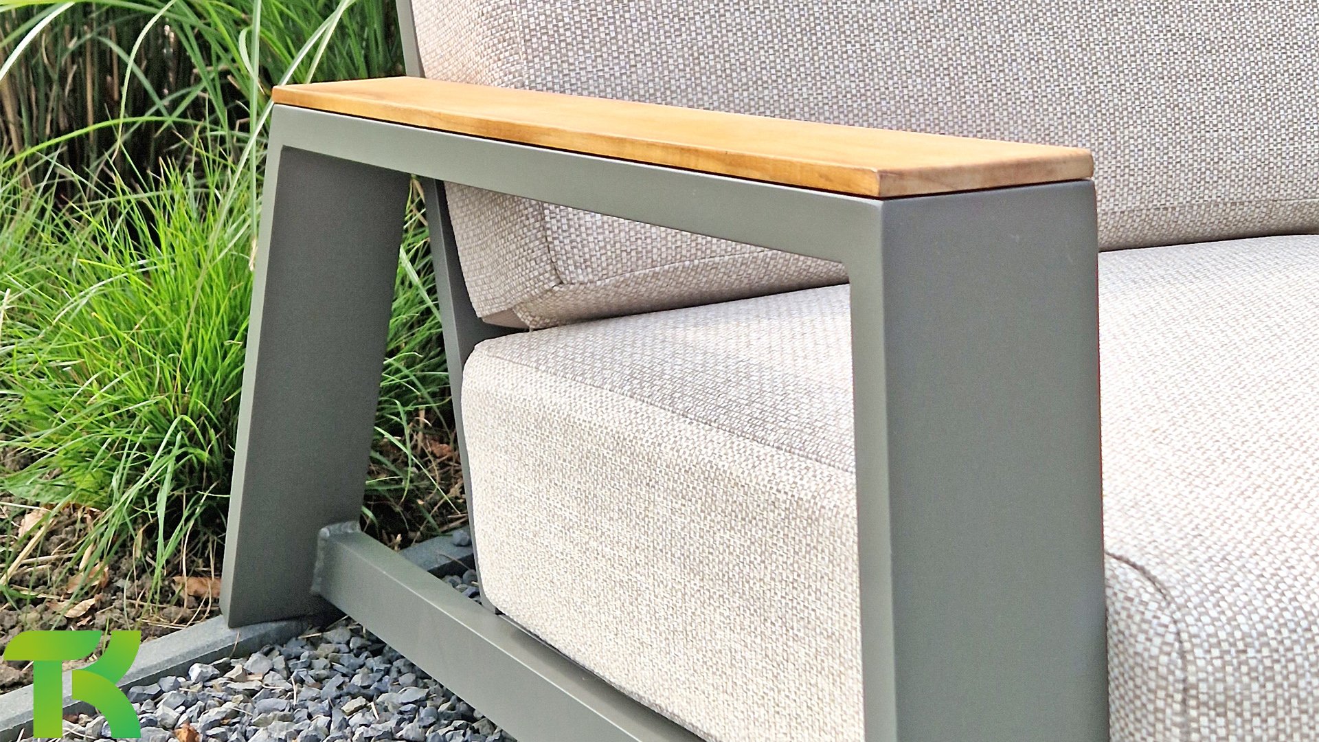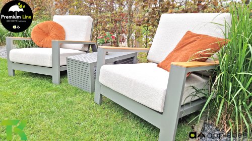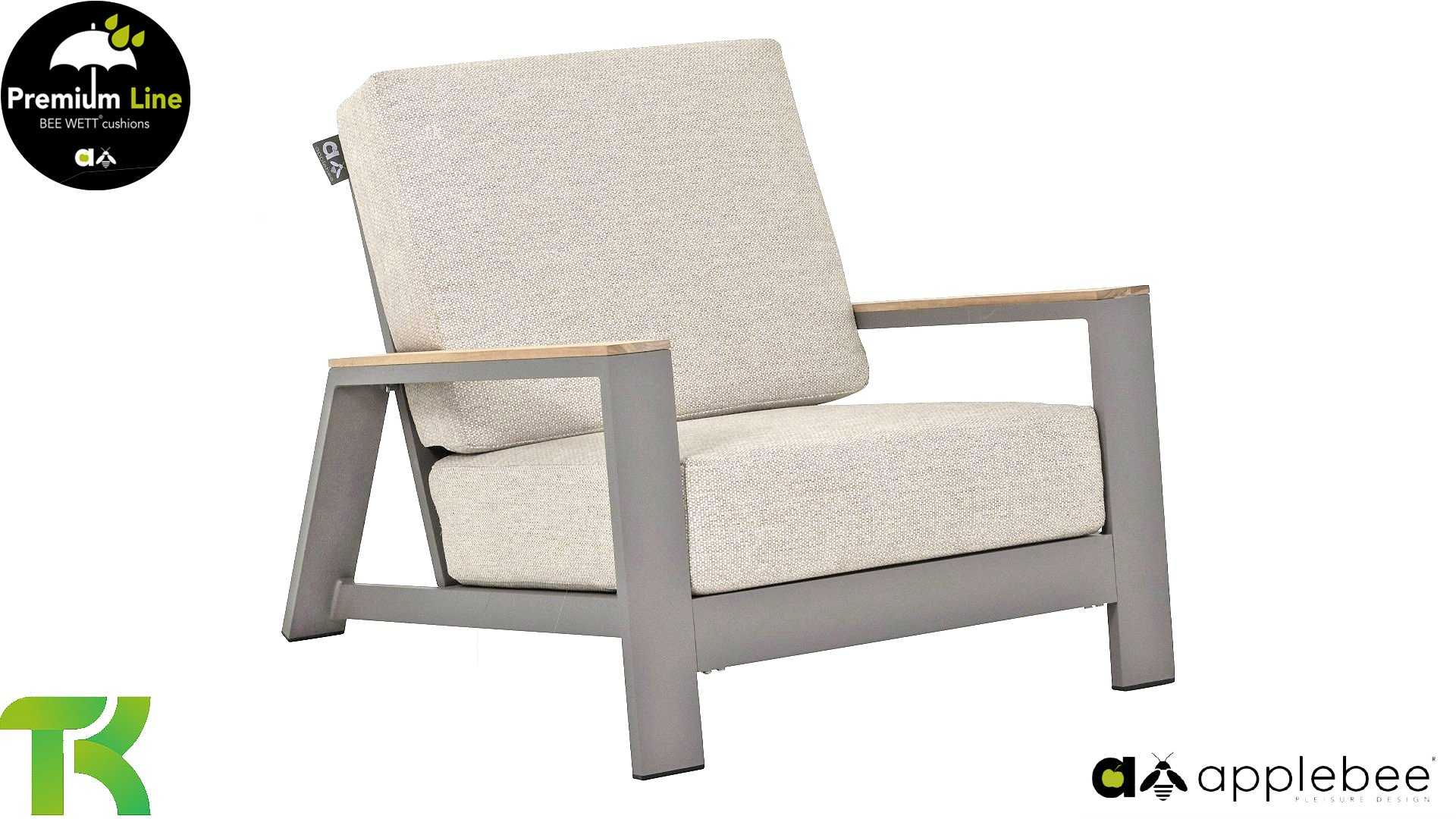 The Apple Bee Spring aluminum taupe collection is minimalist and clean, yet striking thanks to its unique design. Sleek diagonal lines, expertly crafted aluminum, powder-coated in a beautiful taupe, and soft, comfortable cushions upholstered in sand. A touch of teak on the armrest completes the set and adds that extra touch. With furnishings tailored to your own style, you can instantly add your own touch to this "nest in the sun."