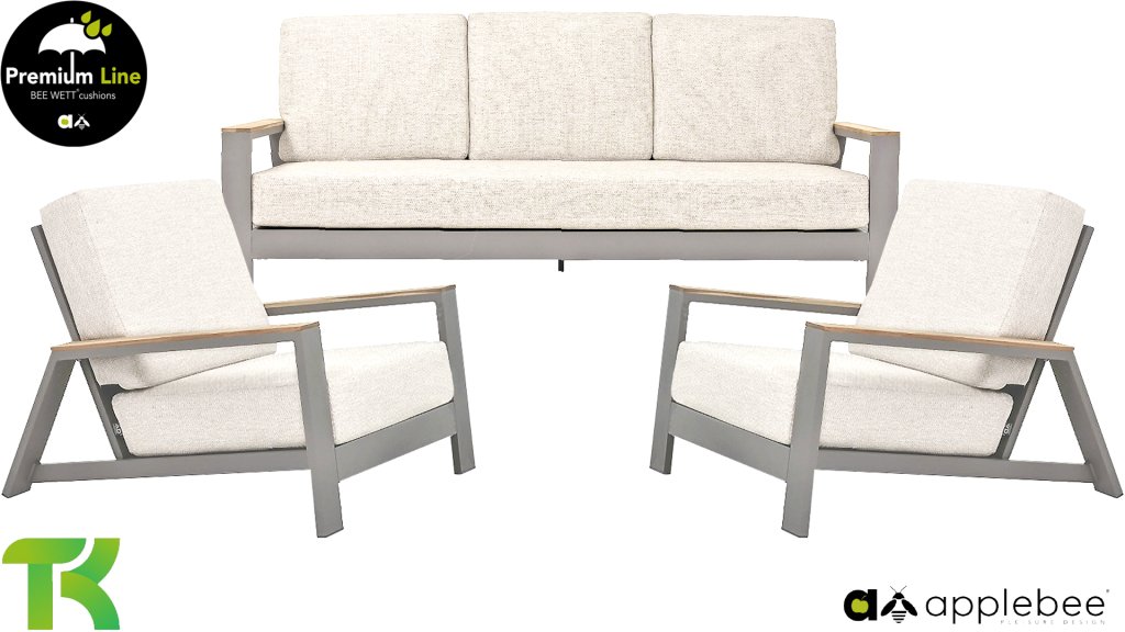 The Apple Bee Spring aluminum taupe collection is minimalist and clean, yet striking thanks to its unique design. Sleek diagonal lines, expertly crafted aluminum, powder-coated in a beautiful taupe, and soft, comfortable cushions upholstered in sand. A touch of teak on the armrest completes the set and adds that extra touch. With furnishings tailored to your own style, you can instantly add your own touch to this "nest in the sun."