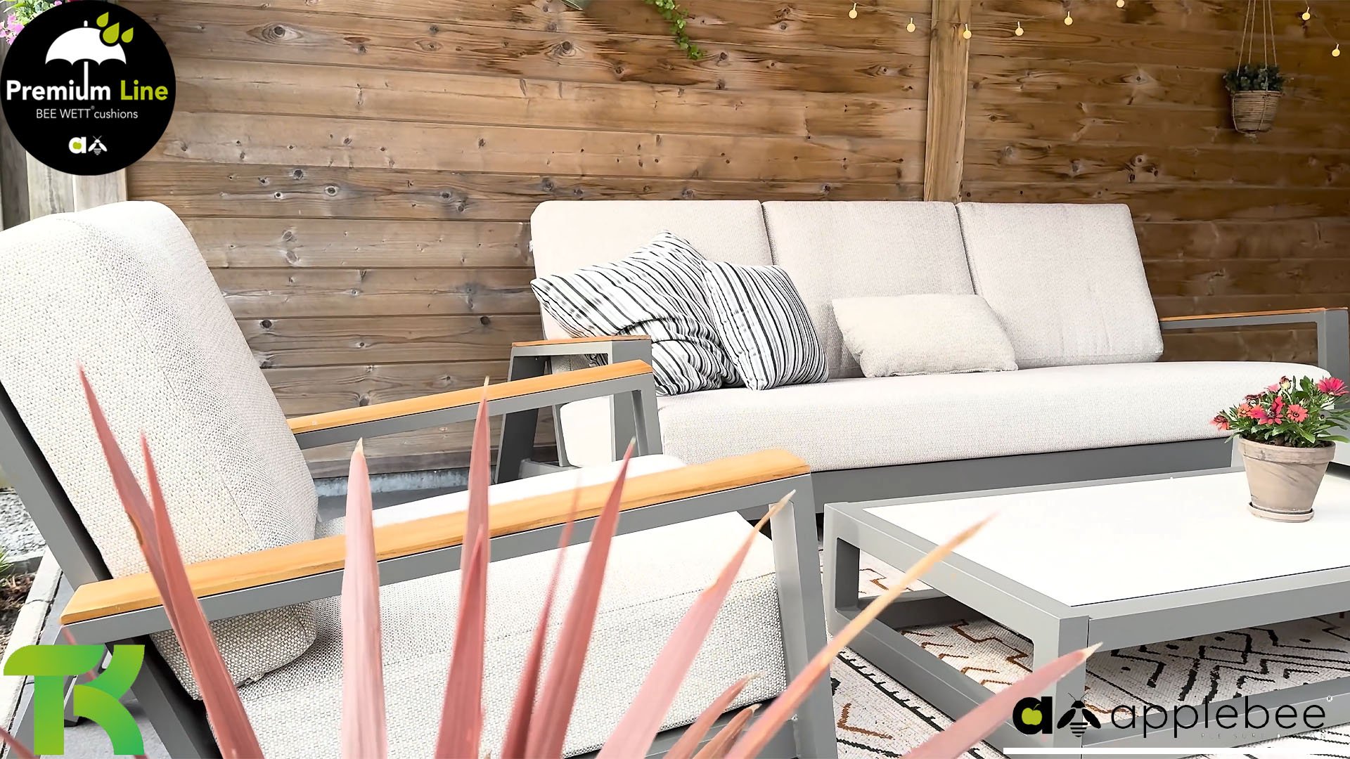 The Apple Bee Spring aluminum taupe collection is minimalist and clean, yet striking thanks to its unique design. Sleek diagonal lines, expertly crafted aluminum, powder-coated in a beautiful taupe, and soft, comfortable cushions upholstered in sand. A touch of teak on the armrest completes the set and adds that extra touch. With furnishings tailored to your own style, you can instantly add your own touch to this "nest in the sun."