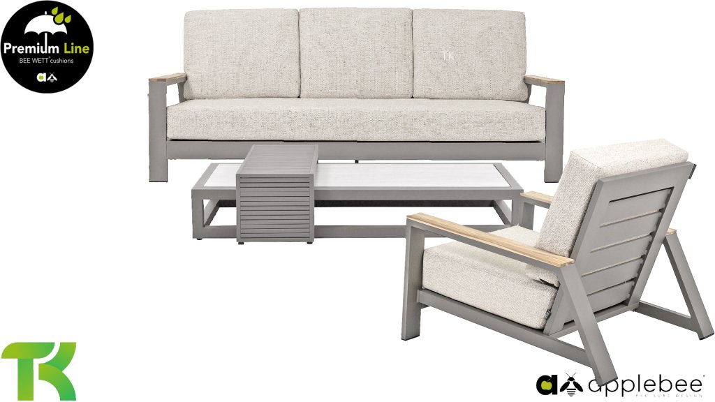 The Apple Bee Santorini Coffee Table Set, of which the frame is aluminum in the color Quartz. The top of the 155cm table is ceramic in the color Travetino. It is an elegant combination, especially with the AppleBee Santorini Lounge Set!