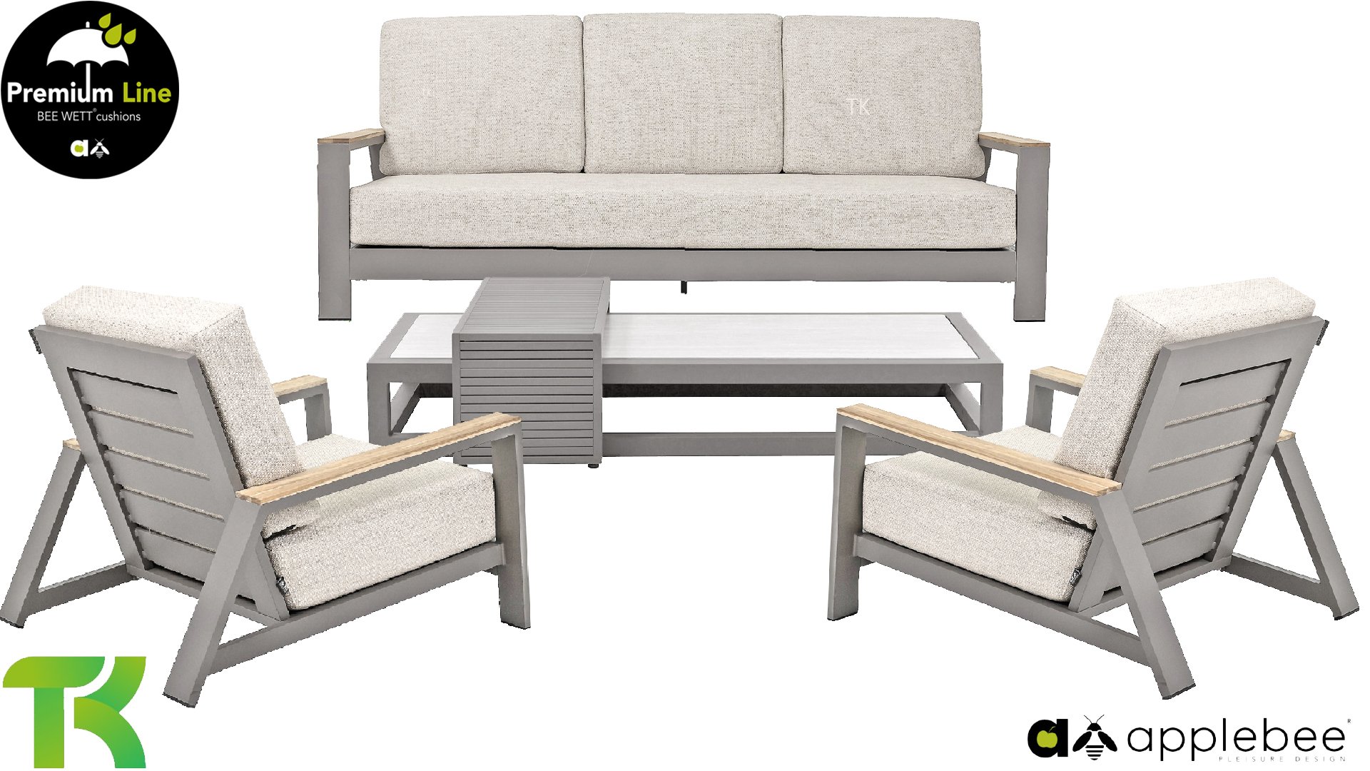 The Apple Bee Spring aluminum taupe collection is minimalist and clean, yet striking thanks to its unique design. Sleek diagonal lines, expertly crafted aluminum, powder-coated in a beautiful taupe, and soft, comfortable cushions upholstered in sand. A touch of teak on the armrest completes the set and adds that extra touch. With furnishings tailored to your own style, you can instantly add your own touch to this "nest in the sun."