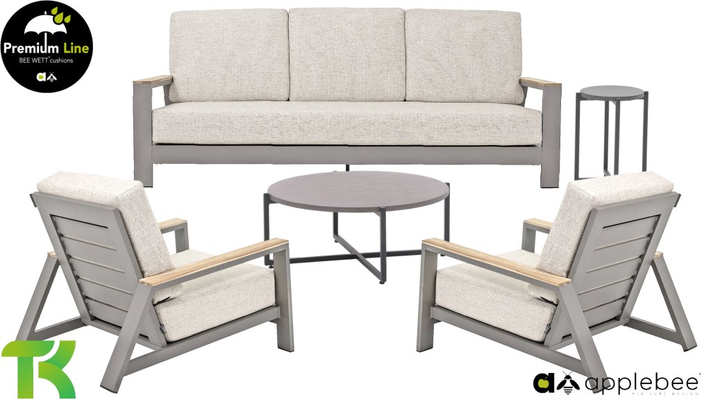 The Apple Bee Spring aluminum taupe collection is minimalist and clean, yet striking thanks to its unique design. Sleek diagonal lines, expertly crafted aluminum, powder-coated in a beautiful taupe, and soft, comfortable cushions upholstered in sand. A touch of teak on the armrest completes the set and adds that extra touch. With furnishings tailored to your own style, you can instantly add your own touch to this "nest in the sun."
