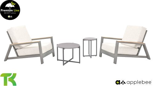 The Apple Bee Spring aluminum taupe collection is minimalist and clean, yet striking thanks to its unique design. Sleek diagonal lines, expertly crafted aluminum, powder-coated in a beautiful taupe, and soft, comfortable cushions upholstered in sand. A touch of teak on the armrest completes the set and adds that extra touch. With furnishings tailored to your own style, you can instantly add your own touch to this "nest in the sun."