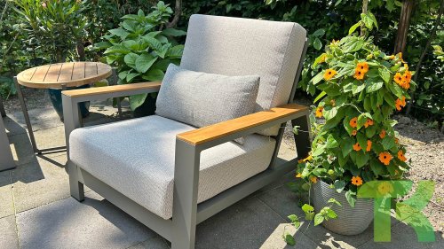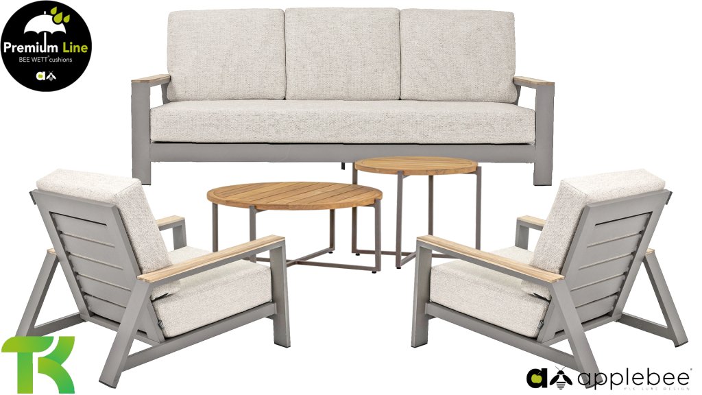 The Apple Bee Spring aluminum taupe collection is minimalist and clean, yet striking thanks to its unique design. Sleek diagonal lines, expertly crafted aluminum, powder-coated in a beautiful taupe, and soft, comfortable cushions upholstered in sand. A touch of teak on the armrest completes the set and adds that extra touch. With furnishings tailored to your own style, you can instantly add your own touch to this "nest in the sun."