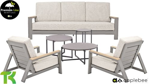 The Apple Bee Spring aluminum taupe collection is minimalist and clean, yet striking thanks to its unique design. Sleek diagonal lines, expertly crafted aluminum, powder-coated in a beautiful taupe, and soft, comfortable cushions upholstered in sand. A touch of teak on the armrest completes the set and adds that extra touch. With furnishings tailored to your own style, you can instantly add your own touch to this "nest in the sun."