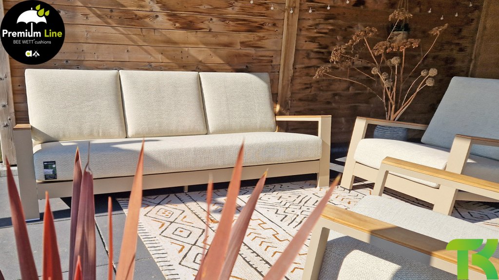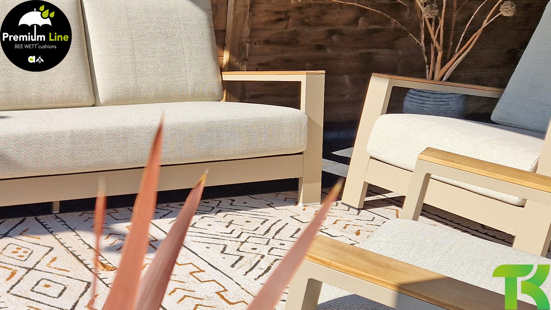 The Apple Bee Spring aluminum latte collection is minimalist and clean, but still stands out due to its unique design. A sleek diagonal play of lines, expertly processed aluminum, powder-coated in a beautiful taupe color and soft, comfortable cushions in a sandy-colored upholstery. A touch of teak on the armrest completes the set and adds that extra detail. With dressing in your own style, you can give your touch to this ‘nest in the sun’.
