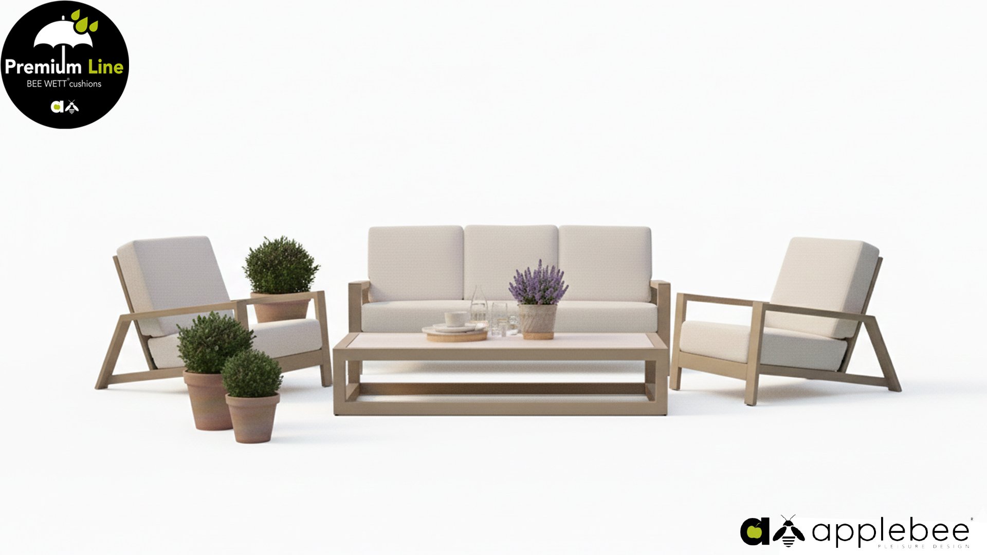 The Apple Bee Spring aluminum latte collection is minimalist and clean, but still stands out due to its unique design. A sleek diagonal play of lines, expertly processed aluminum, powder-coated in a beautiful taupe color and soft, comfortable cushions in a sandy-colored upholstery. A touch of teak on the armrest completes the set and adds that extra detail. With dressing in your own style, you can give your touch to this ‘nest in the sun’.