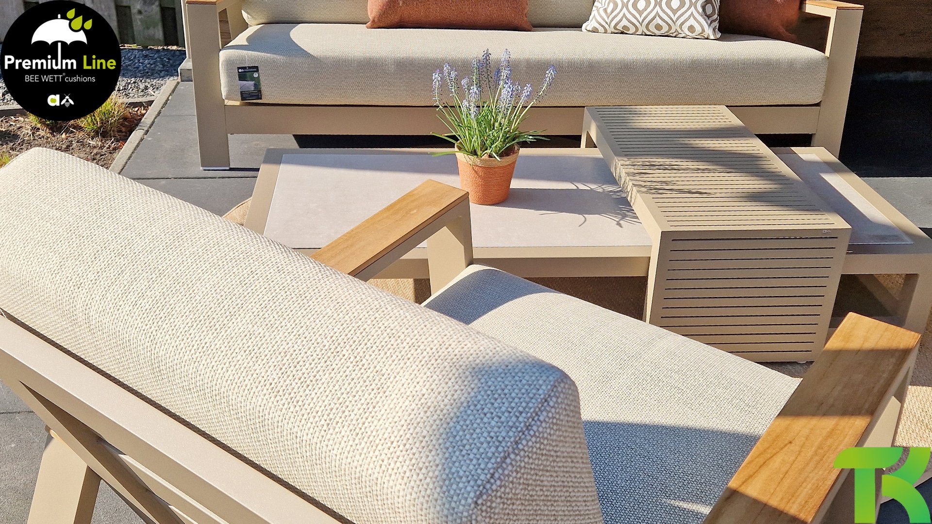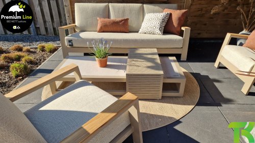 A sleek diagonal play of lines, expertly processed aluminum, powder-coated in a beautiful taupe color and soft, comfortable cushions in a sandy-colored upholstery. A touch of teak on the armrest completes the set and adds that extra detail. With dressing in your own style, you can give your touch to this ‘nest in the sun’.