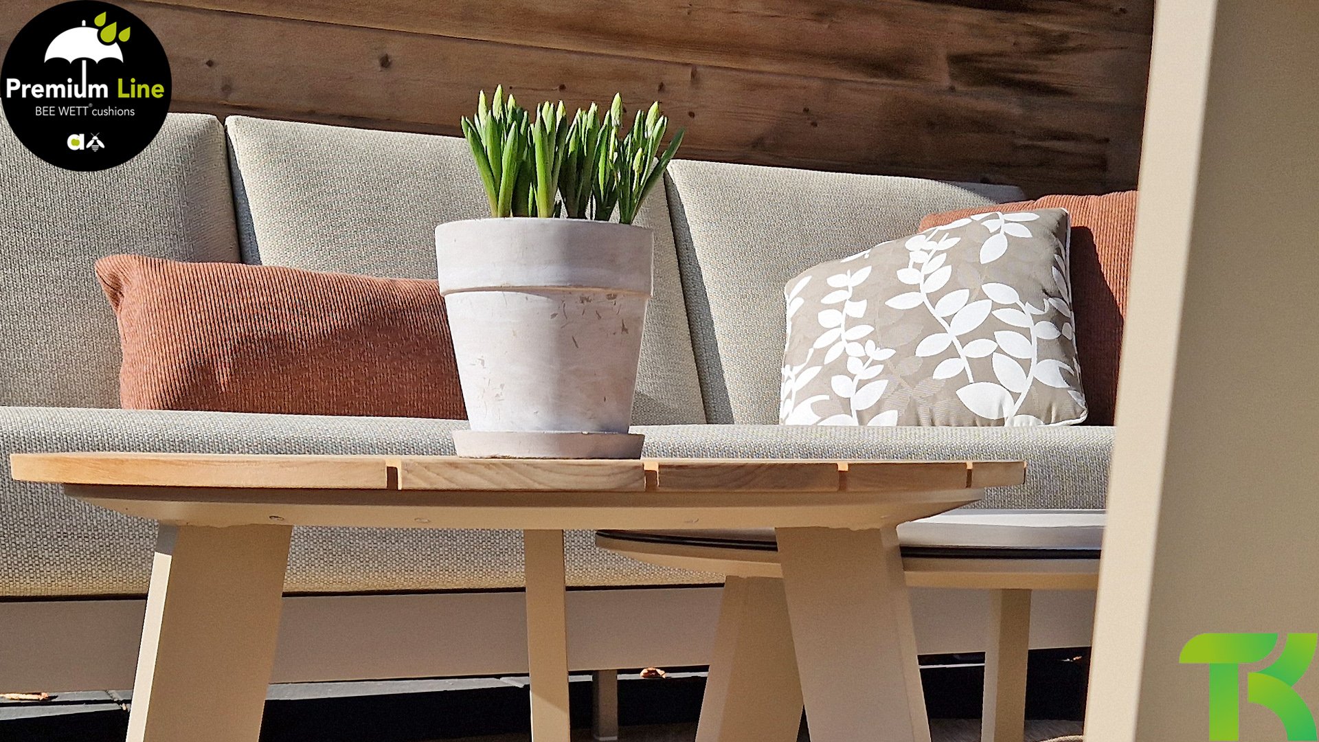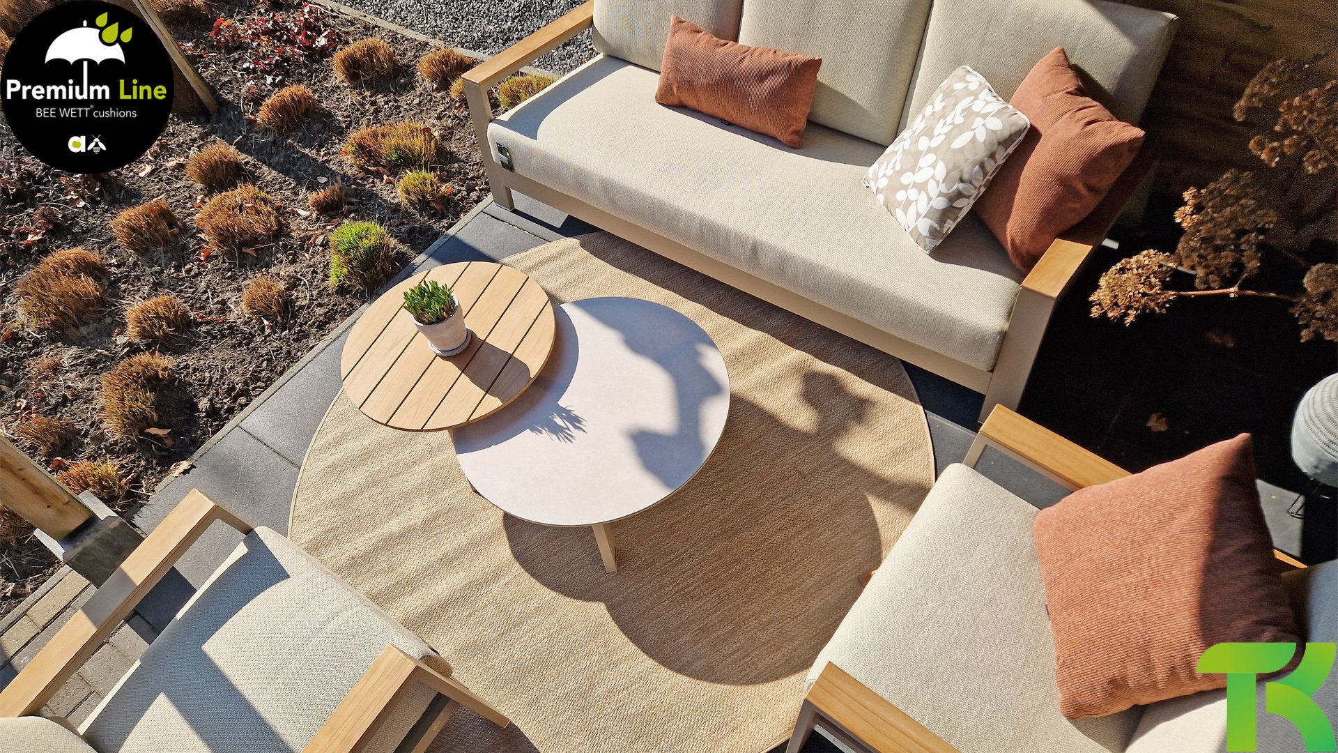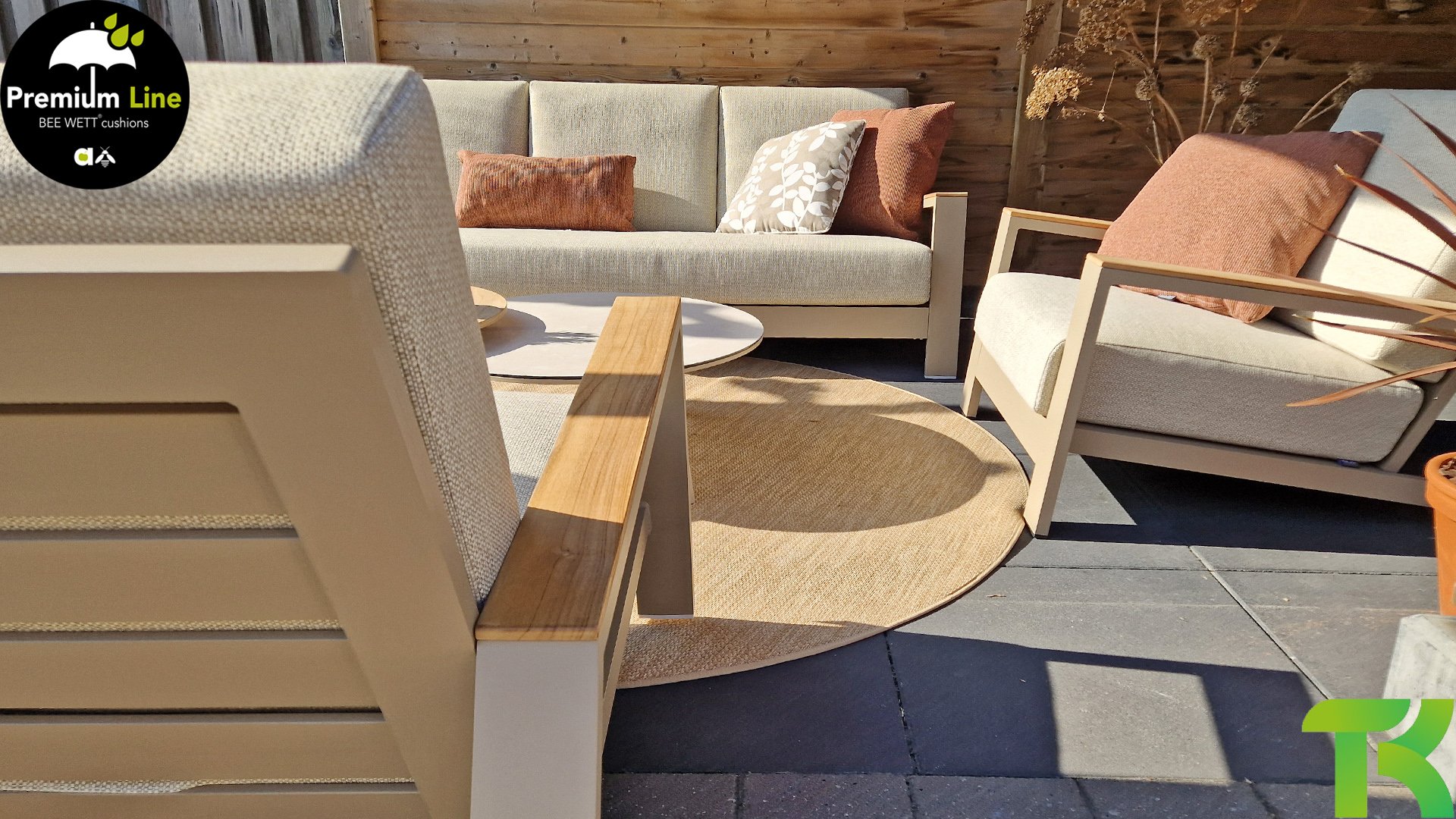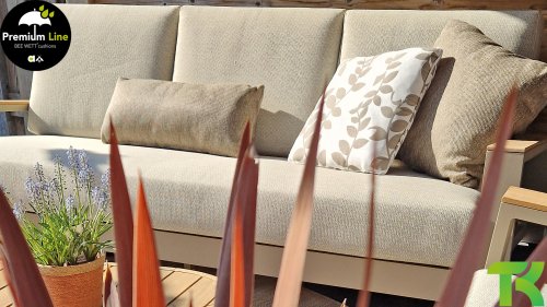 The Apple Bee Spring aluminum latte collection is minimalist and clean, but still stands out due to its unique design. A sleek diagonal play of lines, expertly processed aluminum, powder-coated in a beautiful taupe color and soft, comfortable cushions in a sandy-colored upholstery. A touch of teak on the armrest completes the set and adds that extra detail. With dressing in your own style, you can give your touch to this ‘nest in the sun’.