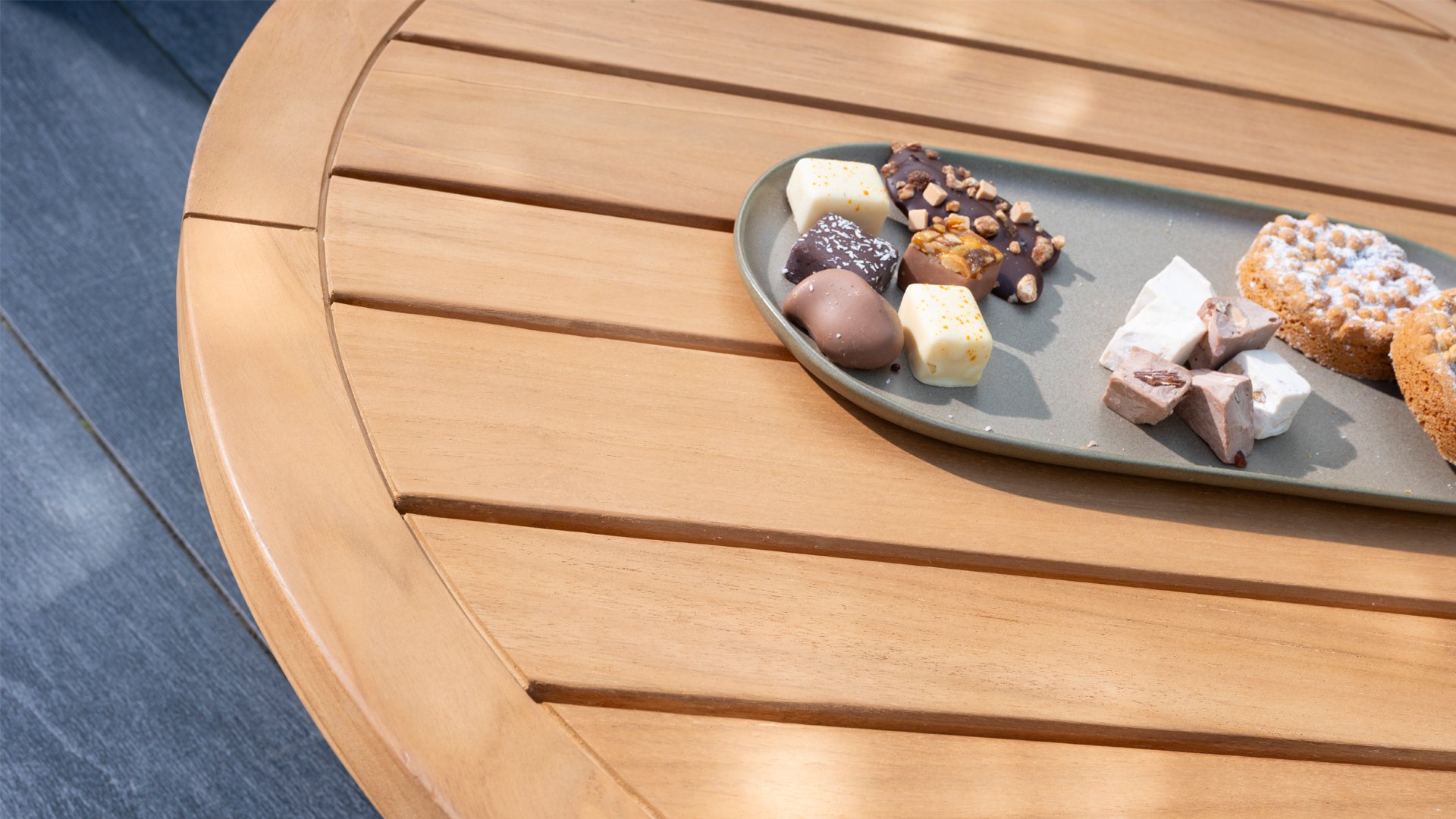 Teak wood is a natural product and particularly suitable for outdoor use. It is resistant to pests and fungi and can withstand sun, rain, and snow. Over time, the teak wood develops a silver-grey patina. Teak wood is a robust material and requires little maintenance. If you prefer the original colour of the teak wood, you can easily prevent the wood from turning grey by regularly using our care product. You can also clean teak wood with soft soap. We provide a guarantee against all manufacturing and construction defects. The natural movement/working of teak wood is not included in this. When you choose teak wood, we expect you to appreciate these characteristics. Hairline cracks that may occur, knots in the teak, rough surfaces over time, or irregular discolouration are not covered by our warranty. These characteristics give the teak wood its own character and appearance and are part of its natural properties. Be careful with a flowerpot or vase on your teak garden table, as this can cause stubborn rings or colour differences. Imperfections are common; these blemishes are characteristic of this product. These irregularities can never give rise to a claim, warranty, or complaint. This is a sign of originality!