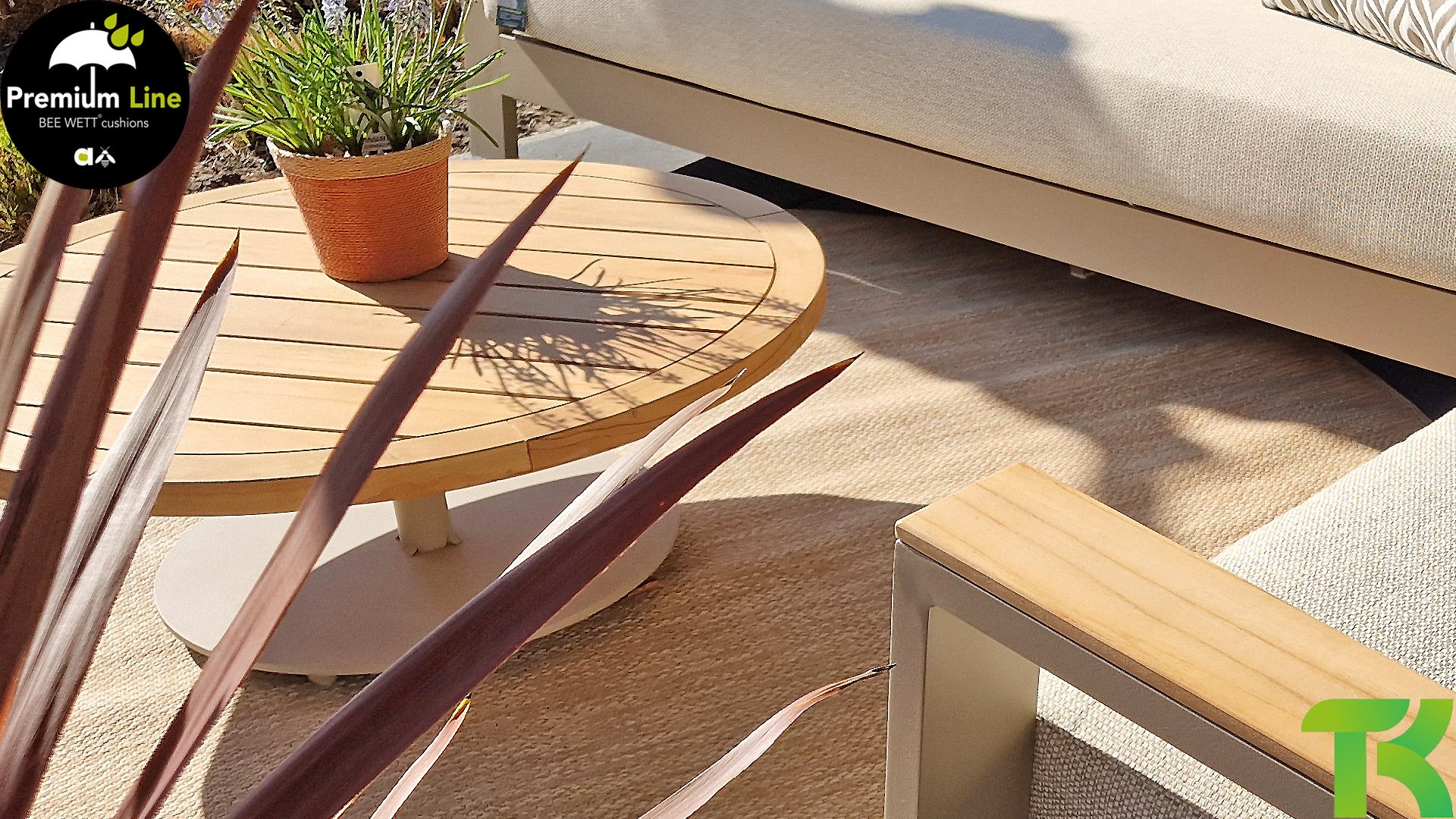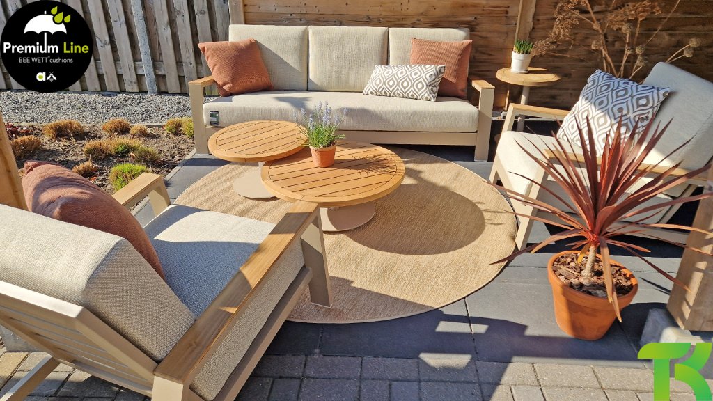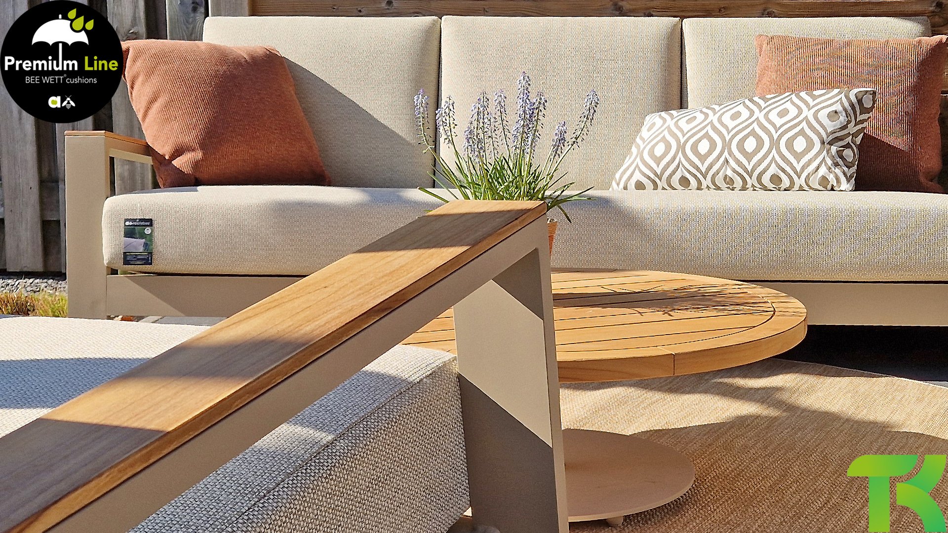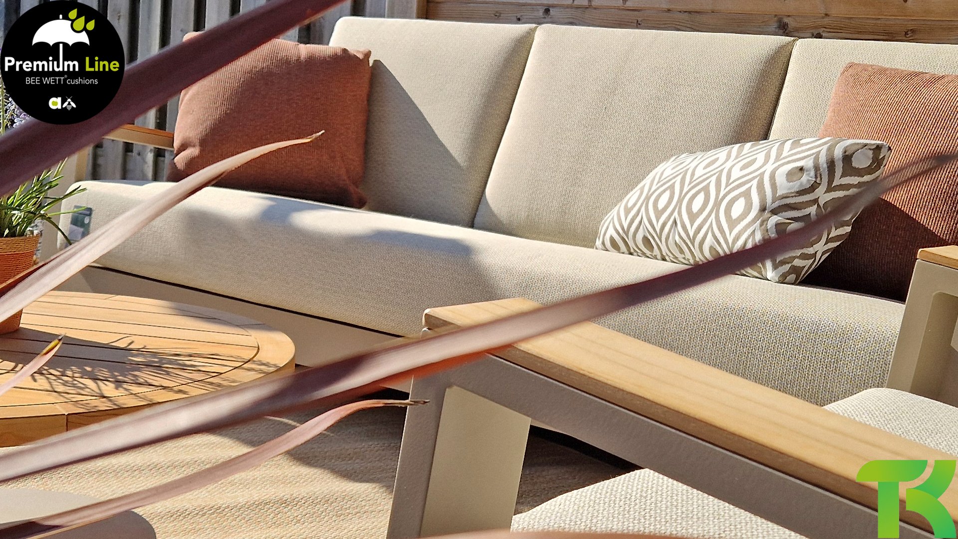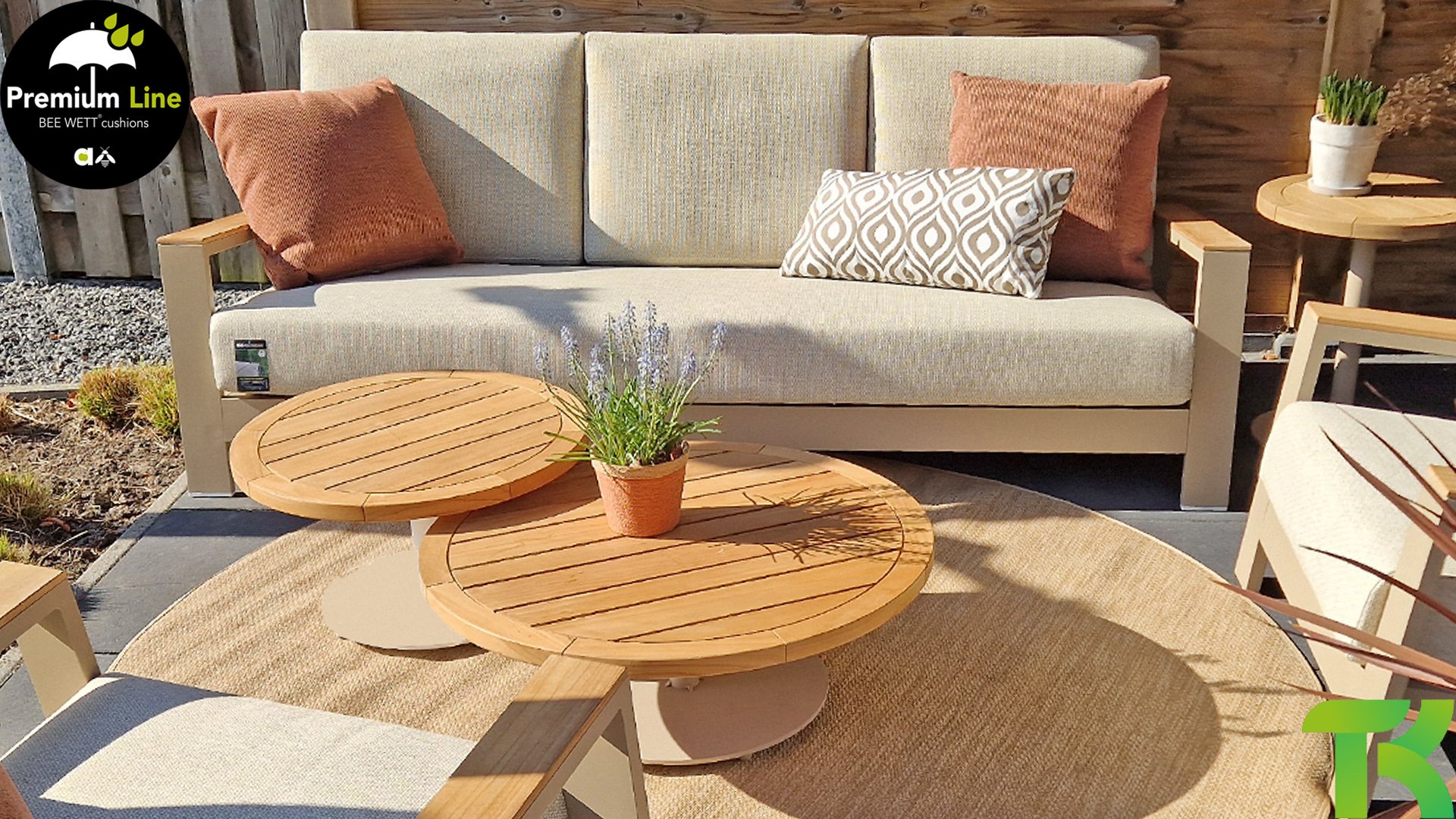 The Apple Bee Spring aluminum latte collection is minimalist and clean, but still stands out due to its unique design. A sleek diagonal play of lines, expertly processed aluminum, powder-coated in a beautiful taupe color and soft, comfortable cushions in a sandy-colored upholstery. A touch of teak on the armrest completes the set and adds that extra detail. With dressing in your own style, you can give your touch to this ‘nest in the sun’.