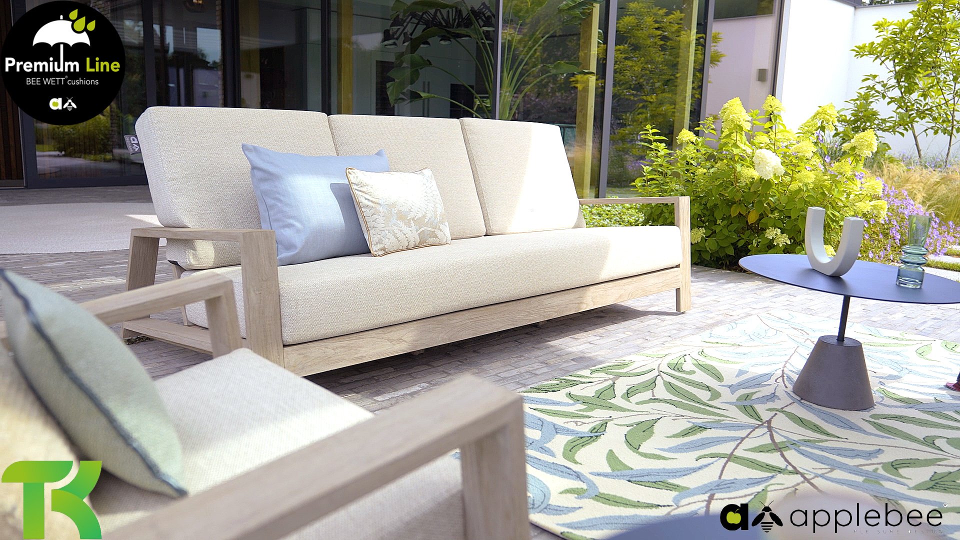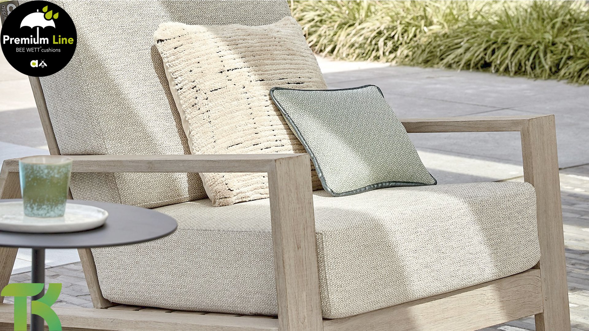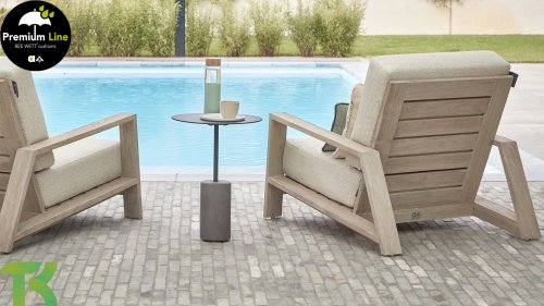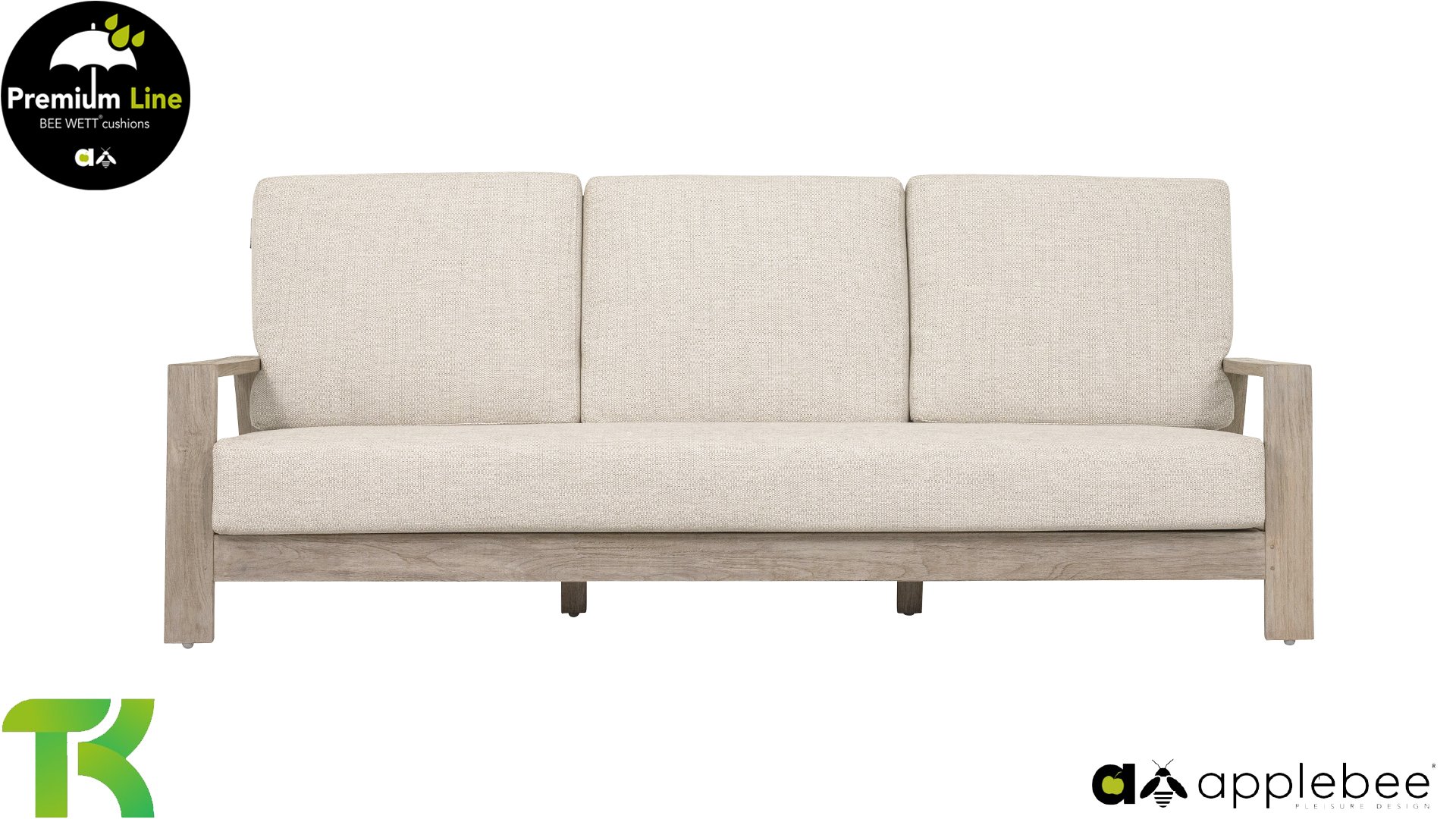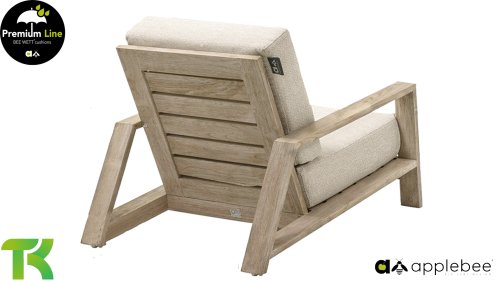 The Apple Bee Spring teak collection is minimalist and clean, yet catches the eye with a special design. A sleek diagonal line pattern, meticulously crafted teak in a Coastal finish, and soft, comfortable cushions in a sandy upholstery.