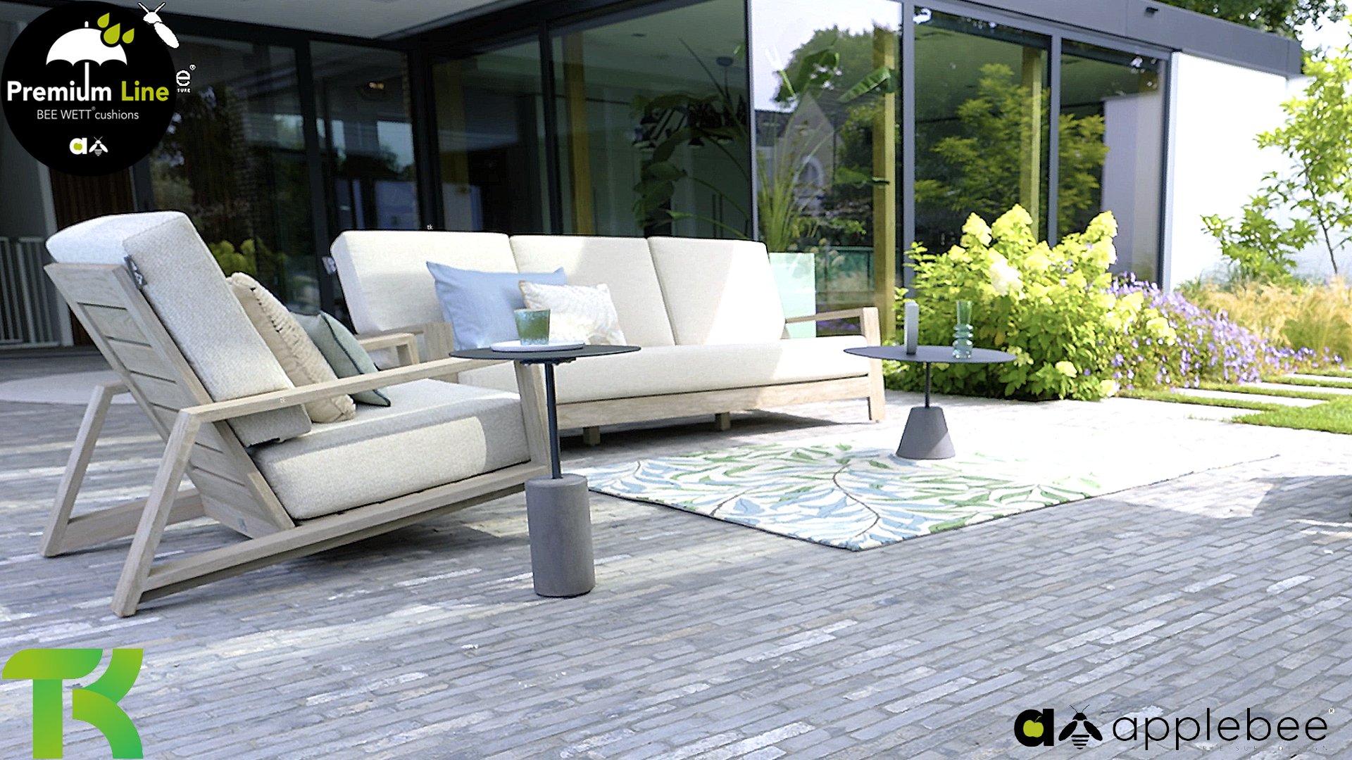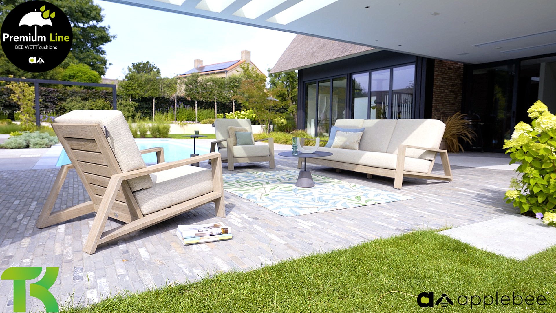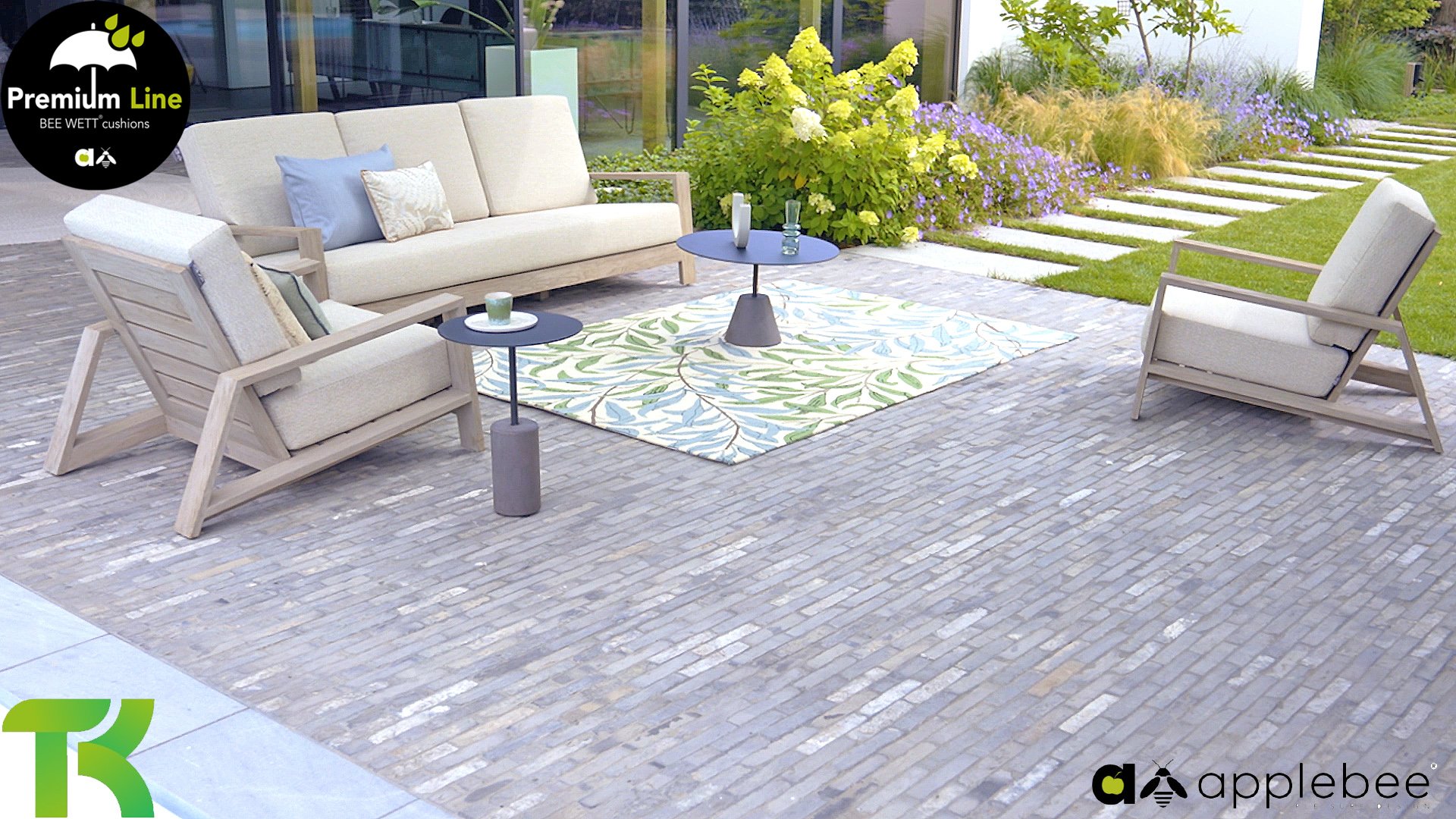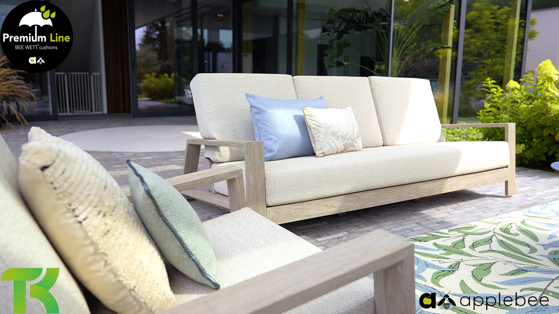 The Apple Bee Spring teak collection is minimalist and clean, yet catches the eye with a special design. A sleek diagonal line pattern, meticulously crafted teak in a Coastal finish, and soft, comfortable cushions in a sandy upholstery.
