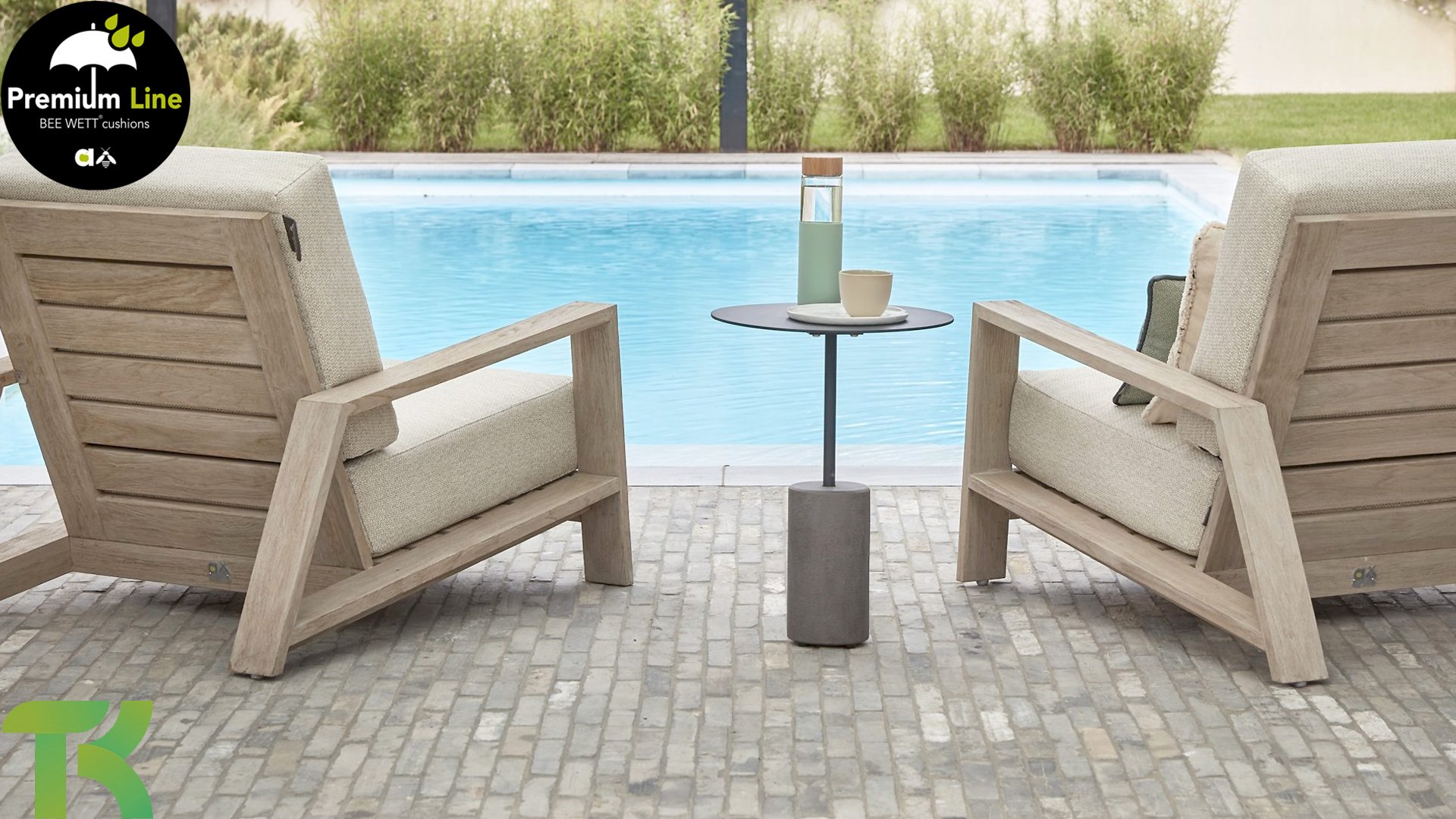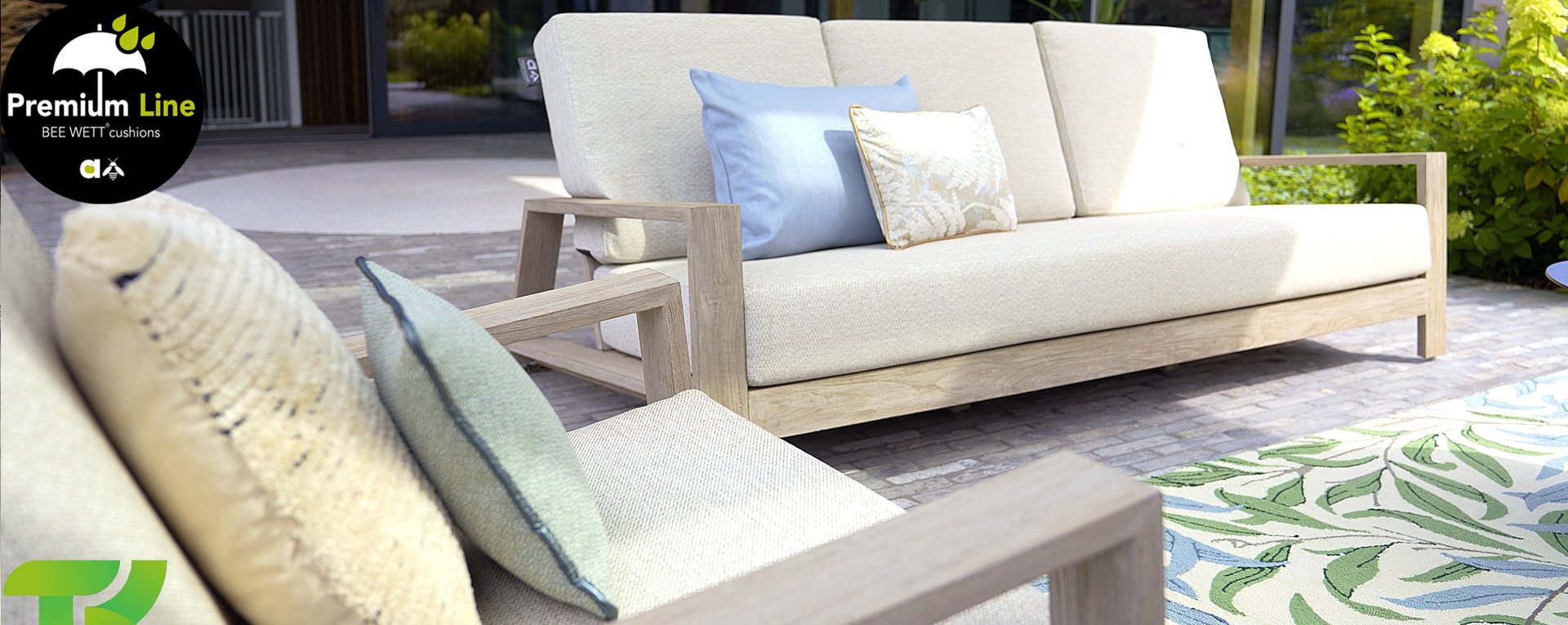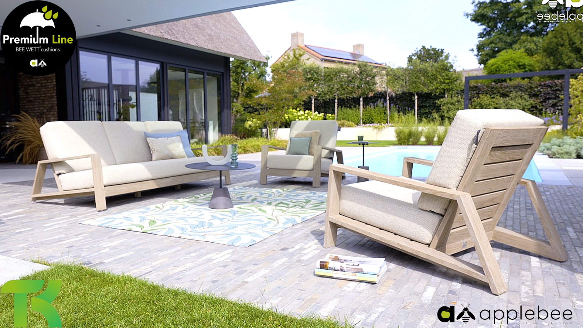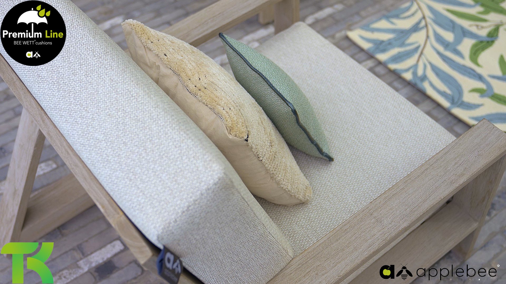 The Apple Bee Spring teak collection is minimalist and clean, yet catches the eye with a special design. A sleek diagonal line pattern, meticulously crafted teak in a Coastal finish, and soft, comfortable cushions in a sandy upholstery.