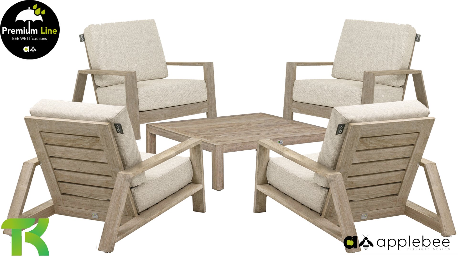 The Apple Bee Spring teak collection is minimalist and clean, yet striking thanks to its unique design. Sleek diagonal lines, handcrafted teak in a Coastal finish, and soft, comfortable cushions in sand-colored upholstery. Crafted entirely from high-quality teak, the set is still a feast for the eyes even when left in your garden without cushions. A tonal gem! With a few beautiful decorative cushions to suit your taste, you can instantly create your own personal style for your own little nest in the sun.