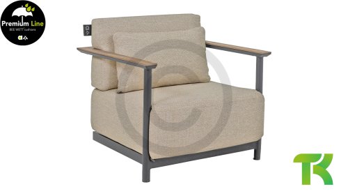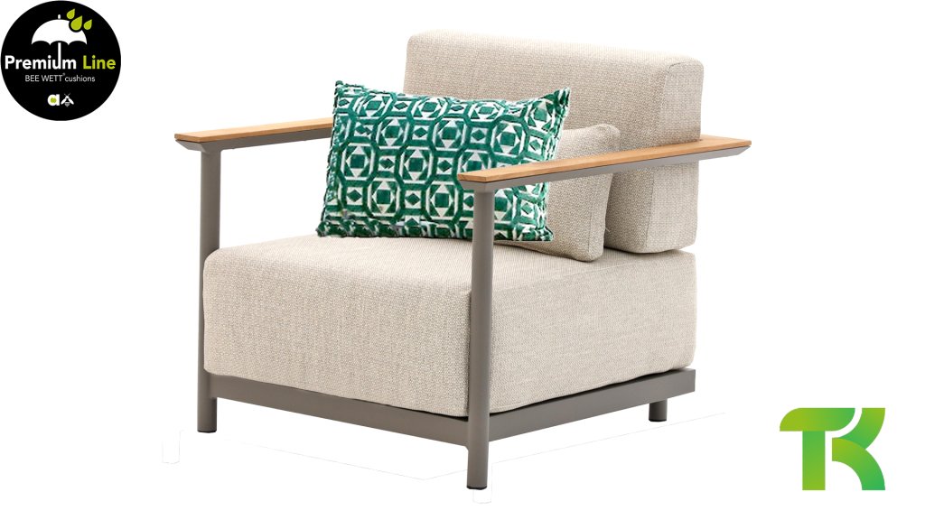 With the Apple Bee St. Lucia aluminum lounge, you'll be sitting comfortably, both literally and figuratively... the cushions are a whopping 25 cm thick! The enormously thick cushions give the St. Lucia an instantly luxurious look. The taupe (quartz) aluminum frame has beautiful round legs and a continuous armrest/backrest. As a finishing touch, the top of the armrest is finished with a Natural SVLK teak trim strip, adding that striking detail typical of this Apple Bee design.