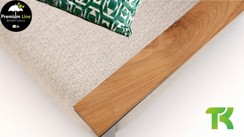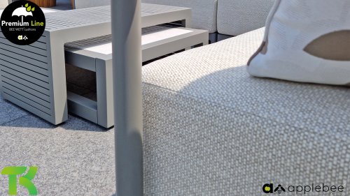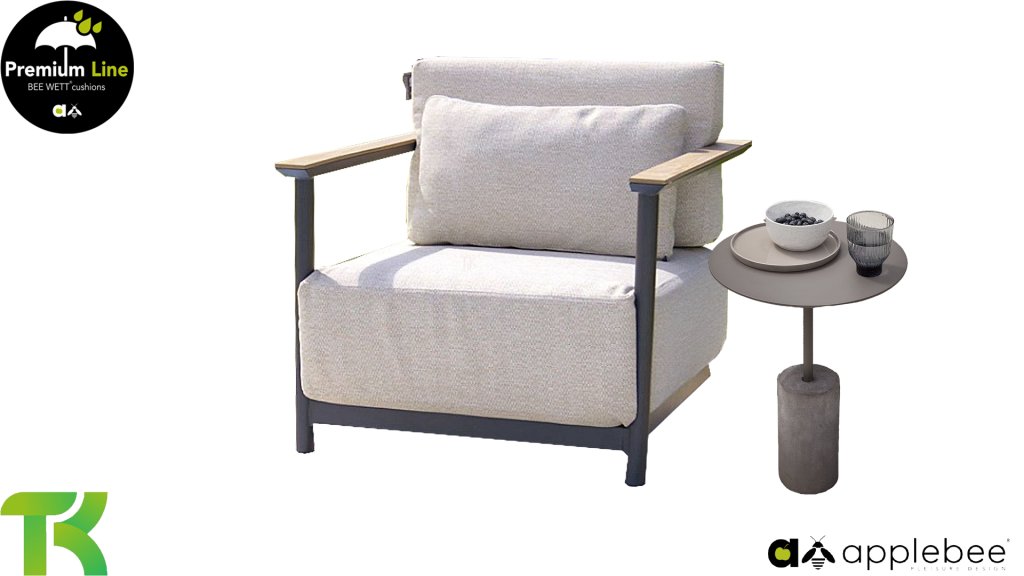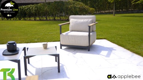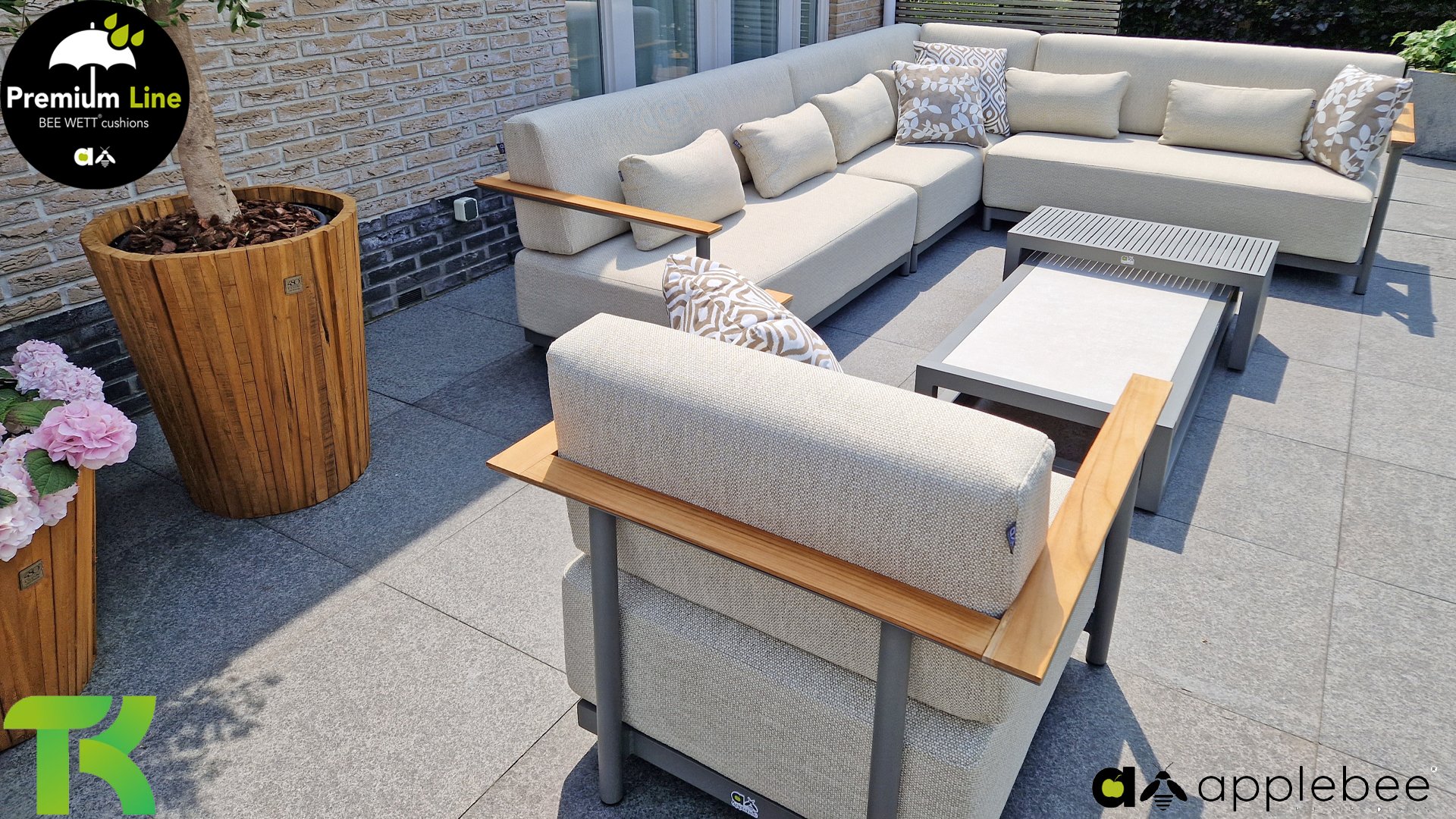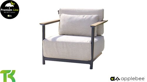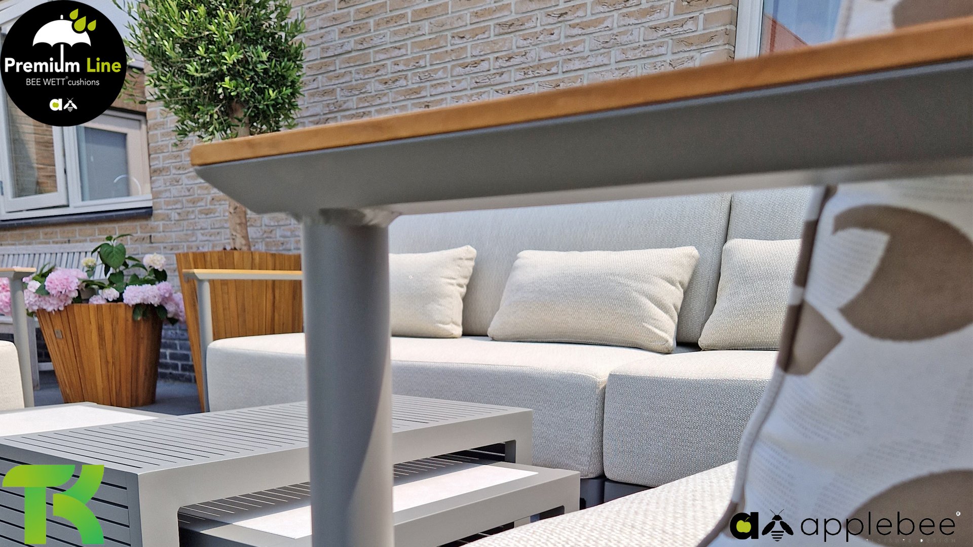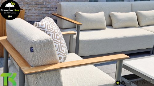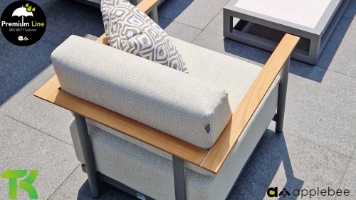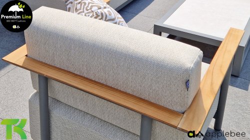 With the Apple Bee St. Lucia aluminum lounge, you'll be sitting comfortably, both literally and figuratively... the cushions are a whopping 25 cm thick! The enormously thick cushions give the St. Lucia an instantly luxurious look. The taupe (quartz) aluminum frame has beautiful round legs and a continuous armrest/backrest. As a finishing touch, the top of the armrest is finished with a Natural SVLK teak trim strip, adding that striking detail typical of this Apple Bee design.