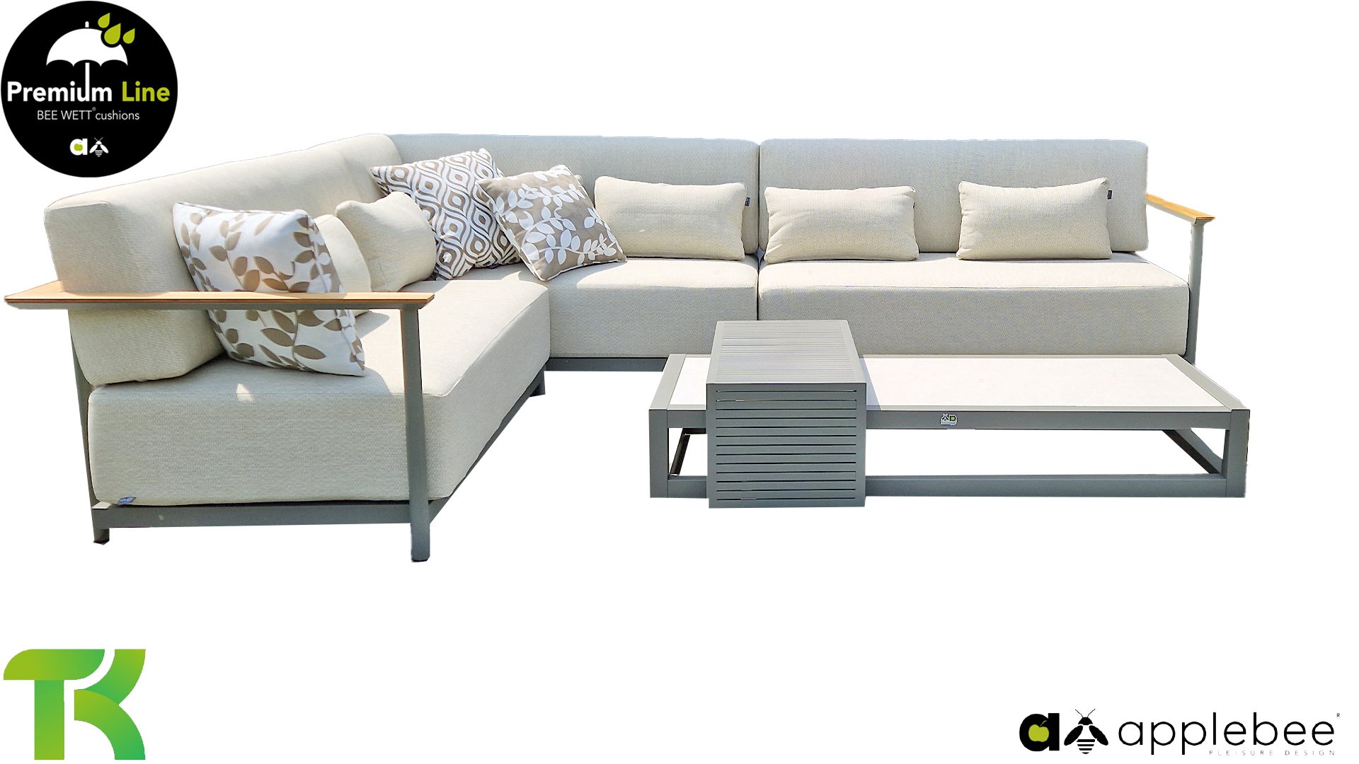 The Apple Bee Santorini Coffee Table Set, with an aluminum base in the Quartz color. The top of the 155cm table is ceramic in the Travetino color. It is an elegant combination, especially with the Apple Bee Santorini Lounge Set!